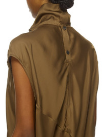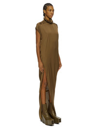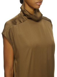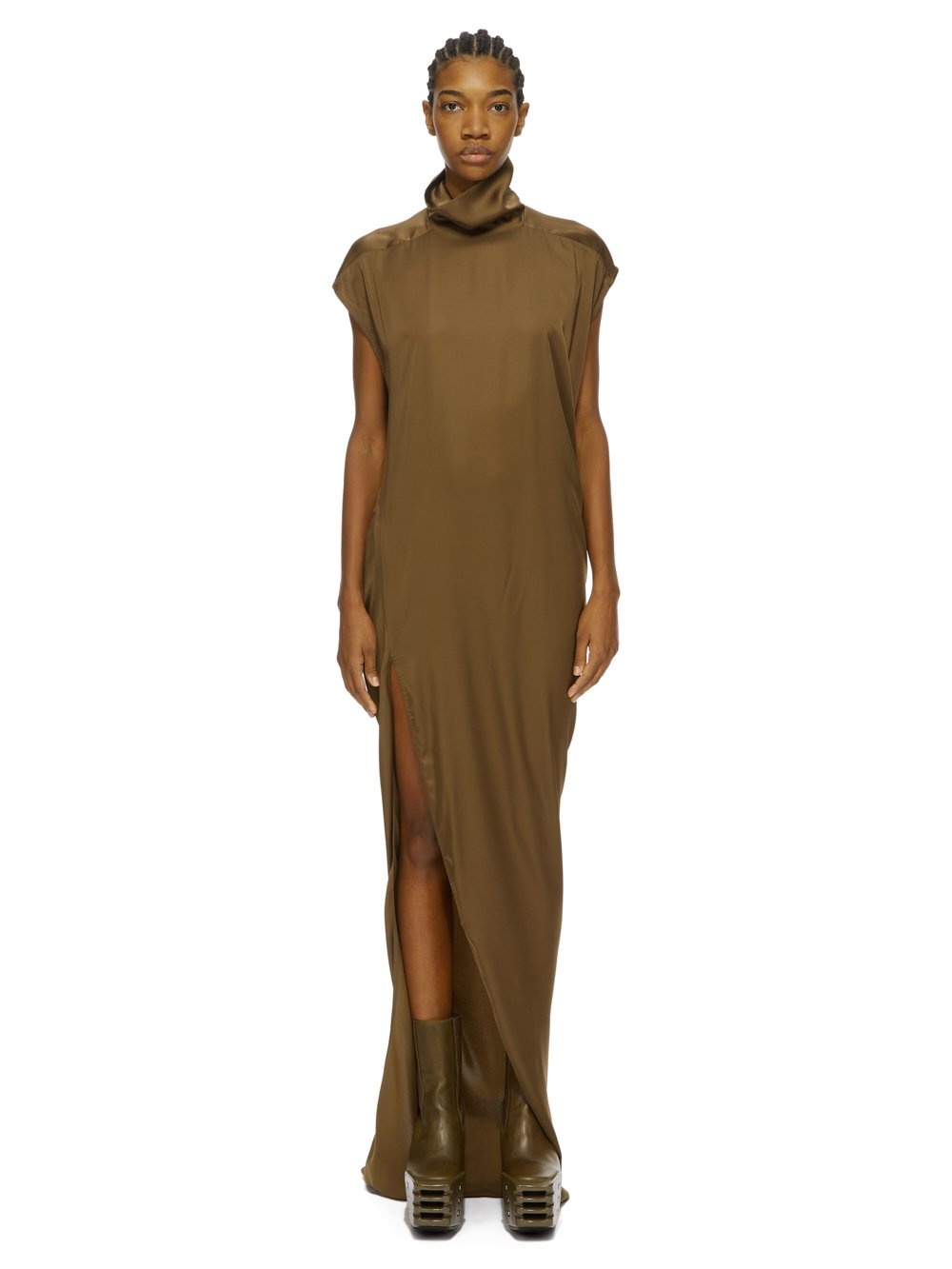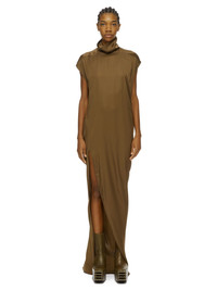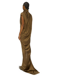 RICK OWENS FW24 PORTERVILLE EDFU T DRESS IN BEAN WASHED CHARMEUSE THIS EDFU T DRESS TRAILS FLOOR LENGTH WITH A SQUARE, LOOSE FIT. IT IS SLEEVELESS WITH WIDE SQUARE SHOULDERS AND LEVEL SHOULDER SEAMS. IT HAS A HIGH NECK WITH CENTRE BACK BUTTON OPENING, AND FEATURES A SKIRT THAT SLOPES FROM A SPLIT, HIGH ON THE RIGHT THIGH, TAPERING INTO A LONG TRAIN THIS LIGHTWEIGHT AND FLUID CHARMEUSE HAS A SEMI-SHINY SURFACE AND WASHED FINISH. THIS FABRIC IS MADE FROM FSC® CERTIFIED VISCOSE WHICH ENSURES THAT THE FIBERS ARE PRODUCED FROM RESPONSIBLY MANAGED SOURCES AND NO DEFORESTATION OCCURS - COLOR: BEAN - MATERIAL: 61% ACETATE + 39% VISCOSE - BUTTONS 100% BUFFALO HORN - MODEL IS 181CM TALL - MODEL WEARS SIZE 40
