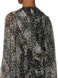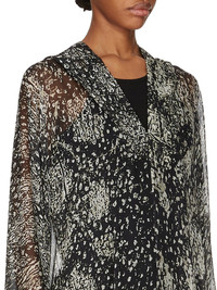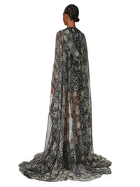 RICK OWENS SS25 HOLLYWOOD RUNWAY HOODED KAFTAN IN BLACK/PEARL WOLFFISH PRINTED SILK CHIFFON THIS HOODED KAFTAN TRAILS FLOOR LENGTH. IT HAS A LARGE HOOD WITH A V NECK AND A SEAM RUNNING DOWN THE CENTRE FRONT. IT IS A VOLUMINOUS KAFTAN SHAPE, WITH A WIDE SHOULDER FALLING INTO A DROPPED ARMHOLE, EXPOSING THE HAND AT THE WRIST IT FEATURES A GEO LINE, RUNNING ACROSS THE SHOULDER, AND THEN DIAGONALLY DOWN THE SIDE BODY THIS LIGHTWEIGHT AND SEMI-TRANSPARENT SILK CHIFFON IS FLUID WITH A MATTE SURFACE AND DRY HANDFEEL. IT IS WOVEN AND DIGITALLY PRINTED WITH OUR SEASONAL WOLFFISH MOTIF IN THE COMO REGION OF ITALY KNOWN FOR ITS HERITAGE OF SILK PRODUCTION COLOR: BLACK/PEARL MATERIAL: 100% SILK MODEL IS 181CM TALL ITEM IS AVAILABLE IN ONE SIZE