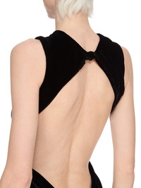 RICK OWENS FW25 CONCORDIANS OPEN BACK GOWN IN BLACK VELVET THIS LOW BACK GOWN IS FLOOR LENGTH AND SLEEVELESS. IT HAS A FRONT PIECE WITH A LOW ROUNDED NECKLINE, AND FINISHES IN A SOFT POINT AT WAIST. ITS SKIRT FALLS WITH SLIGHT DRAPING FROM A BIAS CUT SEAM ON THE LEFT FRONT. ITS BACK HAS A TWIST TOP AND IS COMPLETELY OPEN TO THE SMALL OF THE BACK. IT THEN FALLS INTO A SLIGHT FISHTAIL AT BACK THIS LIGHTWEIGHT AND FLUID VELVET HAS A SOFT AND WASHED UNEVEN FINISH THIS FABRIC IS MADE FROM FSC® CERTIFIED VISCOSE WHICH ENSURES THAT THE FIBERS ARE PRODUCED FROM RESPONSIBLY MANAGED SOURCES AND NO DEFORESTATION OCCURS COLOR: BLACK MATERIAL: 82% VISCOSE + 18% SILK MODEL IS 181CM TALL MODEL WEARS SIZE 40