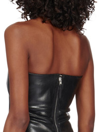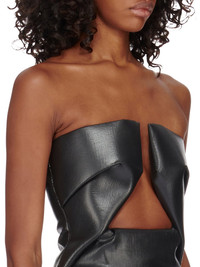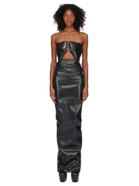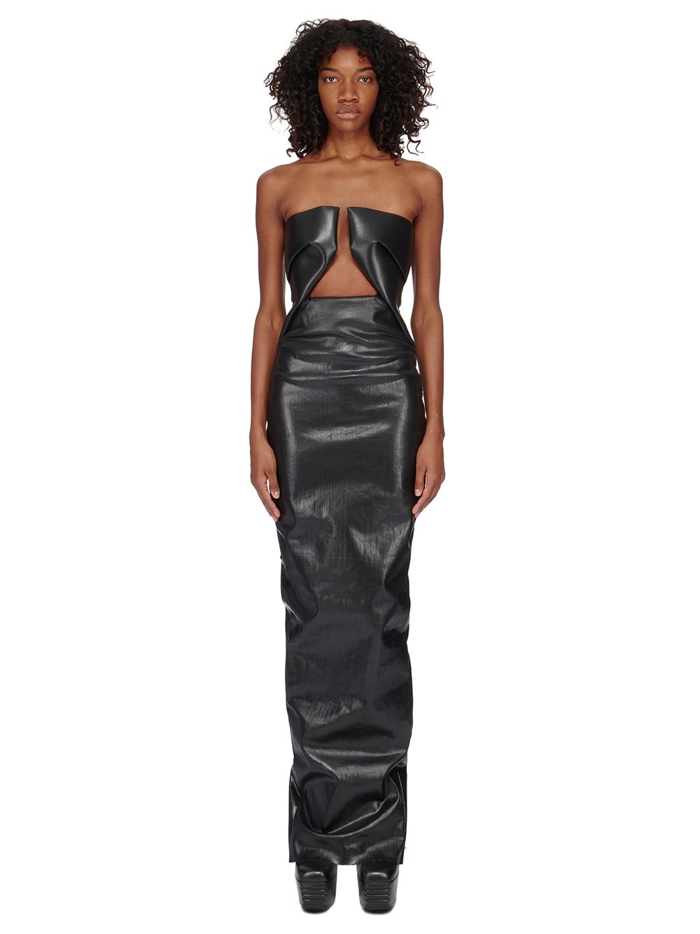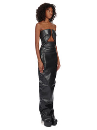 RICK OWENS FW23 LUXOR PRONG GOWN IN BLACK CRACKED STRETCH DENIM THIS PRONG GOWN IS FLOOR LENGTH AT FRONT. IT FEATURES A STRAPLESS STRUCTURED BODICE WITH A BONED GEOMETRIC CUTOUT FRONT AND FOLDED BUST DETAIL. IT HAS A TIGHT FITTING SKIRT WHICH TAPERS SLIGHTLY TO THE ANKLE WITH A HIGH CENTRE BACK SPLIT, AND EXPOSED ZIPPER CLOSURE THIS LIGHTWEIGHT STRETCH DENIM HAS A SOFT, MATTE FILM OVERLAY. AFTER THE DENIM BASE IS OVER DYED AND COATED WITH A DARK GLUE, THE FILM IS APPLIED BY HEAT PRESS AND TUMBLED TO CREATE THE SOFT HAND FEEL AND CRACKED EFFECT. SINCE THE FILM IS APPLIED DIRECTLY ON THE READY GARMENT, SEAMS AND DETAILS MAKE THE APPLICATION IRREGULAR, EXPOSING THE UNDERLYING DENIM IN CERTAIN AREAS. THIS IS AN INHERENT CHARACTERISTIC OF THIS TYPE OF TREATMENT AND IS A DESIRED VISUAL ASPECT WHICH MAKES EACH PIECE UNIQUE - COLOR: BLACK - MATERIAL: 91% COTTON + 6% ELASTOMULTIESTER + 3% RUBBER - INNER BUSTIER 97% COTTON + 3% ELASTANE - MODEL IS WEARING SIZE 40 - MODEL IS 181 CM TALL