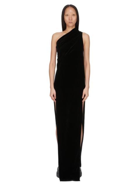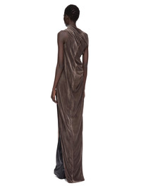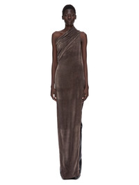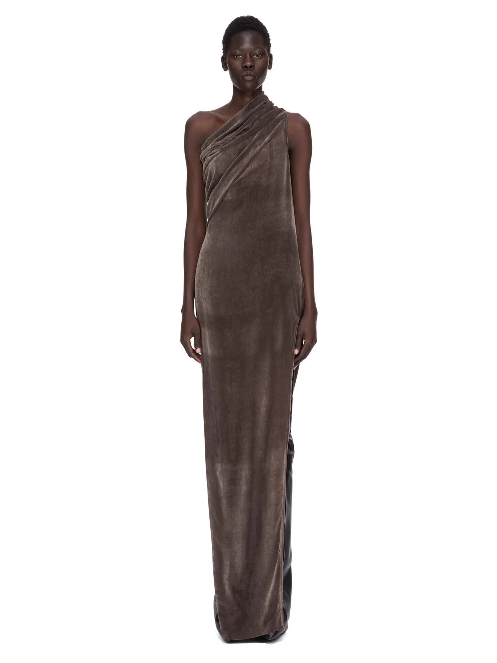 RICK OWENS FW25 CONCORDIANS ATHENA ARROWHEAD GOWN IN DARKDUST VELVET THIS ATHENA ARROWHEAD GOWN IS FLOOR LENGTH. IT HAS ONE RIGHT SHOULDER WITH AN ASYMMETRICAL NECKLINE THAT DRAPES ACROSS THE BODY. IT FEATURES A SKIRT WITH TWO HIGH SIDE SLITS WHICH TAPERS SLIGHTLY TO THE FLOOR WITH A CENTRE BACK SEAM THIS LIGHTWEIGHT AND FLUID VELVET HAS A SOFT AND WASHED UNEVEN FINISH THIS FABRIC IS MADE FROM FSCĀ® CERTIFIED VISCOSE WHICH ENSURES THAT THE FIBERS ARE PRODUCED FROM RESPONSIBLY MANAGED SOURCES AND NO DEFORESTATION OCCURS COLOR: DARKDUST MATERIAL: 82% VISCOSE + 18% SILK MODEL IS 181CM TALL MODEL WEARS SIZE 40