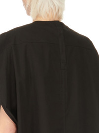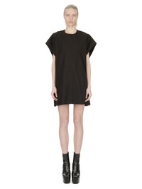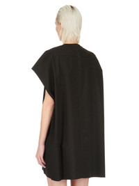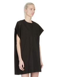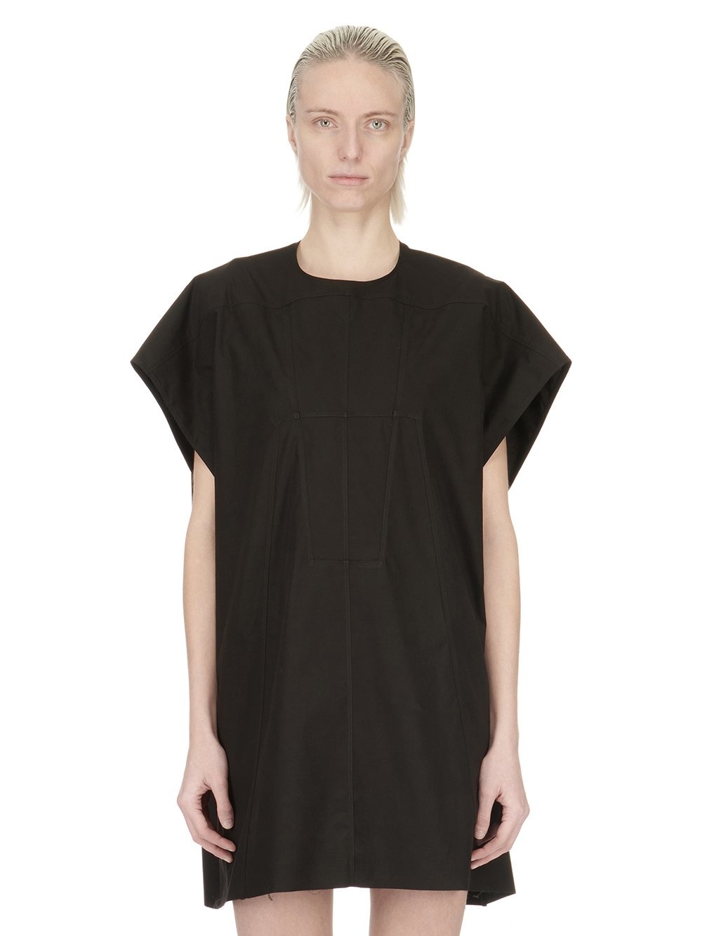 RICK OWENS SS24 LIDO SPLINTERED MINI DRESS IN BLACK COTTON POPLIN THIS SPLINTERED MINI DRESS GOWN IS MID-THIGH LENGTH AND SLEEVELESS WITH A JUMBO BOXY FIT. IT HAS A ROUND NECK, WIDE SHOULDERS, CREATING CAPS SLEEVES, AND A SEAM RUNNING DOWN THE CENTRE BACK SPINE. IT FEATURES A FRONT YOKE SEAM RUNNING ACROSS THE CHEST AND THE SPLINTERED MOTIVO, WITH LINES DESCENDING FROM THE NECK TO A BLUNT POINT AT THE WAIST AND ACROSS THE CHEST THEN SLOPING DOWN THE SIDE BODY. THIS LIGHTWEIGHT CLASSIC POPLIN FABRIC HAS A SOFT HANDFEEL AND WASHED FINISH. THIS FABRIC IS MADE USING GOTS CERTIFIED ORGANIC COTTON WHICH MEANS THE NATURAL FIBER IS GROWN WITHOUT HARMFUL CHEMICALS, LEAVING OUR SOIL, AIR AND WATER CLEANER FROM CONTAMINATES - COLOR: BLACK - MATERIAL: 100% COTTON - MODEL IS 181CM TALL - MODEL WEARS SIZE 40