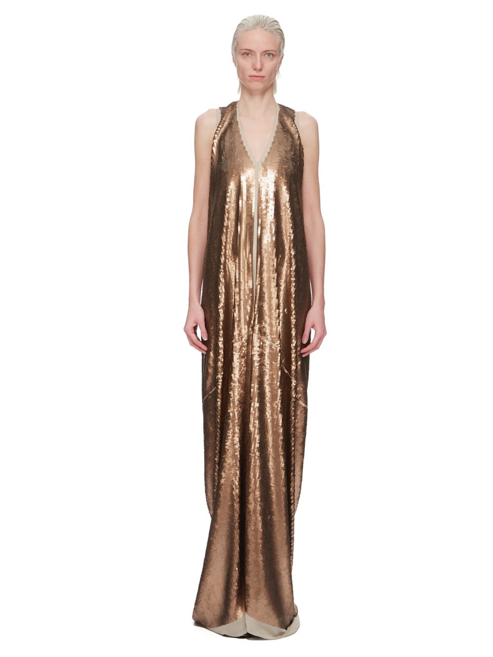 RICK OWENS FW24 PORTERVILLE DUSTULATOR DRESS IN PEARL/FAWN SEQUIN EMBROIDERED SILK CHIFFON THIS DUSTULATOR DRESS IS TRAILING-FLOOR LENGTH WITH A SLIGHT RISE IN THE CENTRE FRONT. IT FEATURES A V NECK AND VOLUMINOUS BODY WITH SLIGHTLY DRAPED BACK. IT HAS A SEAM RUNNING DOWN THE CENTRE FRONT, AND DOWN THE CENTRE BACK SPINE. THIS VERSION IS MADE FROM SEQUIN EMBROIDERED FABRIC WITH AN ENGINEERED TECHNIQUE WHERE EACH OF THE GARMENTS' PANELS IS EMBROIDERED SEPARATELY BEFORE CONSTRUCTION, LEAVING VISIBLE A SLIGHT TRACING OF THE BASE FABRIC UNDERNEATH AROUND THE SEAM LINES THIS SEMI-TRANSPARENT SILK CHIFFON IS EMBROIDERED WITH SMALL ORNAMENTAL SEQUIN DISKS IT IS WOVEN IN THE COMO REGION OF ITALY KNOWN FOR ITS HERITAGE OF SILK PRODUCTION AND IS MADE USING GOTS CERTIFIED ORGANIC SILK WHICH MEANS THE NATURAL FIBER IS MADE WITHOUT HARMFUL CHEMICALS, LEAVING OUR SOIL, AIR AND WATER CLEANER FROM CONTAMINATES COLOR: PEARL/FAWN MATERIAL: 100% SILK EMBROIDERY 100% POLYESTER MODEL IS 181CM TALL MODEL WEARS SIZE 40