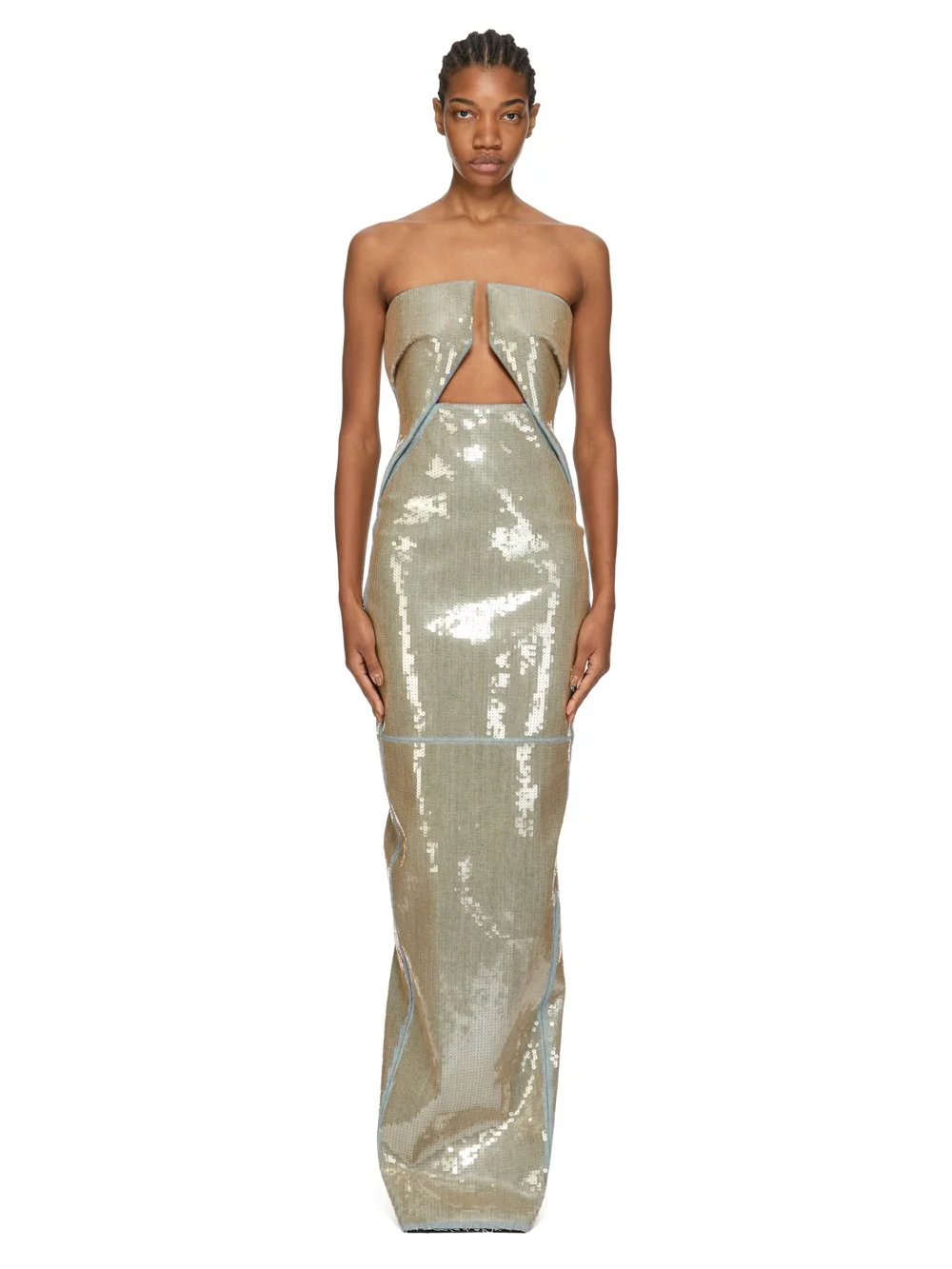 RICK OWENS SS26 TEMPLE PRONG GOWN IN BLUE/SAND SEQUIN EMBROIDERED STRETCH DENIM THIS PRONG GOWN IS FLOOR-LENGTH. IT FEATURES A STRAPLESS STRUCTURED BODICE WITH A BONED GEOMETRIC CUTOUT FRONT, AND FOLDED BUST DETAIL. IT HAS A TIGHT FITTING SKIRT THAT TAPERS SLIGHTLY TO THE ANKLE WITH A HIGH CENTER BACK SPLIT, AND EXPOSED ZIPPER CLOSURE THIS LIGHTWEIGHT STRETCH DENIM IS EMBROIDERED WITH SMALL ORNAMENTAL SEQUIN DISKS COLOR: BLUE/SAND MATERIAL:91% COTTON + 6% ELASTOMULTIESTER + 3% RUBBER FIBER INNER BUSTIER 97% COTTON + 3% ELASTANE EMBROIDERY 100% POLYEST MODEL IS 181CM TALL MODEL WEARS SIZE 40