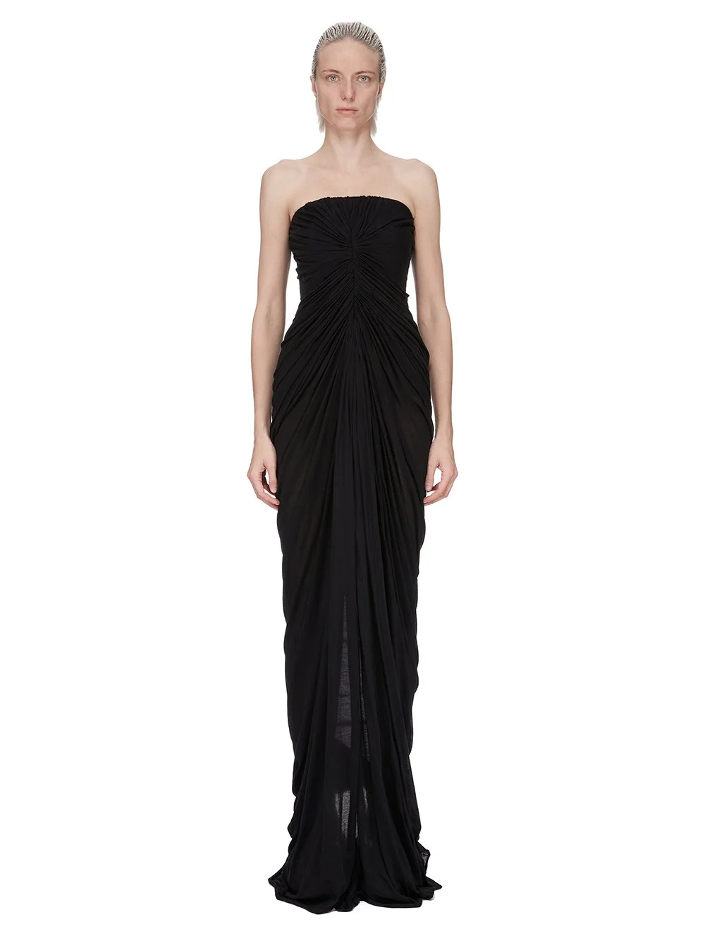 RICK OWENS FW25 CONCORDIANS RADIANCE BUSTIER GOWN IN BLACK UNSTABLE COTTON THIS RADIANCE BUSTIER GOWN IS FLOOR LENGTH. IT HAS A STRAPLESS STRUCTURED BUSTIER TOP WITH A PLEATED DRAPING THAT RADIATES OUT FROM THE CENTRE FRONT BODY, DRAPES ACROSS THE BACK AND FALLS TO THE FLOOR. THE DRESS OPENS WITH A CENTRE BACK ZIPPER. THIS LIGHTWEIGHT COTTON JERSEY IS SEMI-TRANSPARENT WITH A SOFT HANDFEEL. THIS JERSEY IS MADE USING GOTS CERTIFIED ORGANIC COTTON WHICH MEANS THE NATURAL FIBER IS GROWN WITHOUT HARMFUL CHEMICALS, LEAVING OUR SOIL, AIR AND WATER CLEANER FROM CONTAMINATES. WE STRIVE TO KEEP OUR PRODUCTION AS LOCAL AS POSSIBLE. THE FULL MANUFACTURING CYCLE OF THIS PRODUCT, FROM THE MATERIAL KNITTING TO SEWING AND FINISHING, WAS UNDERTAKEN CLOSE TO OUR HOME BASE IN CONCORDIA, ITALY. COLOR: BLACK MATERIAL: 100% COTTON INNER BUSTIER 84% NYLON + 16% ELASTANE MODEL IS 181CM TALL MODEL WEARS SIZE 38