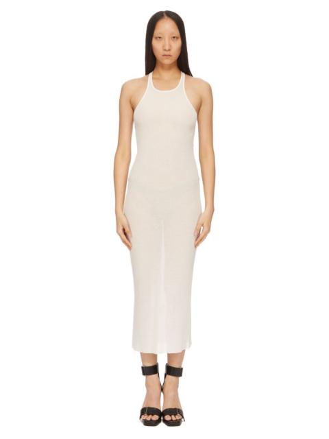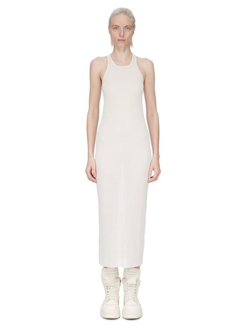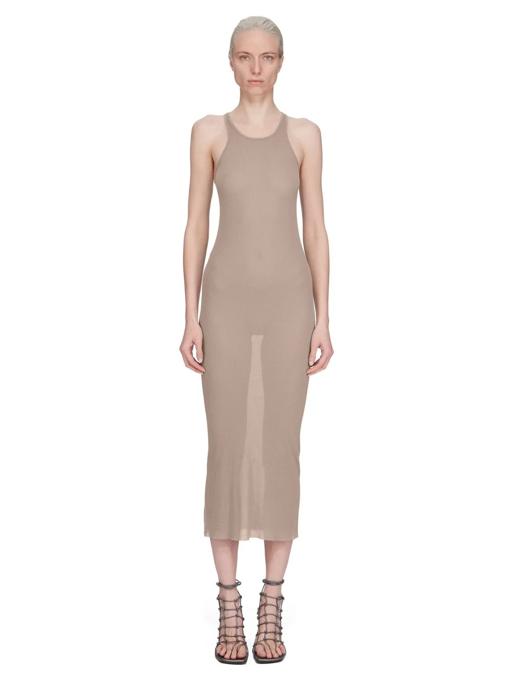 RICK OWENS SS25 HOLLYWOOD TANK DRESS IN FLESH VISCOSE SILK RIB JERSEY THIS TANK DRESS IS BELOW-KNEE LENGTH WITH A CLOSE TO THE BODY FIT. IT HAS A ROUND NECKLINE AND THIN SHOULDER STRAPS THAT FLOW INTO A SLIGHT RACER BACK. IT HAS A RAW CUT HEM AND FEATURES THE SIGNATURE SINGLE SEAM RUNNING DOWN THE CENTER BACK SPINE THIS LIGHTWEIGHT VISCOSE AND SILK RIB JERSEY HAS A DISTINCT RIB PATTERN AND SOFT HANDFEEL THIS JERSEY IS MADE FROM FSC® (FSC – C162846) CERTIFIED VISCOSE WHICH ENSURES THAT THE FIBERS ARE PRODUCED FROM RESPONSIBLY MANAGED SOURCES AND NO DEFORESTATION OCCURS. WE STRIVE TO KEEP OUR PRODUCTION AS LOCAL AS POSSIBLE. THE FULL MANUFACTURING CYCLE OF THIS PRODUCT, FROM THE MATERIAL KNITTING TO SEWING AND FINISHING, WAS UNDERTAKEN CLOSE TO OUR HOME BASE IN CONCORDIA, ITALY COLOR: FLESHMATETIAL: 88% VISCOSE + 12% JERSEY MODEL IS 181CM TALL MODEL WEARS SIZE 40