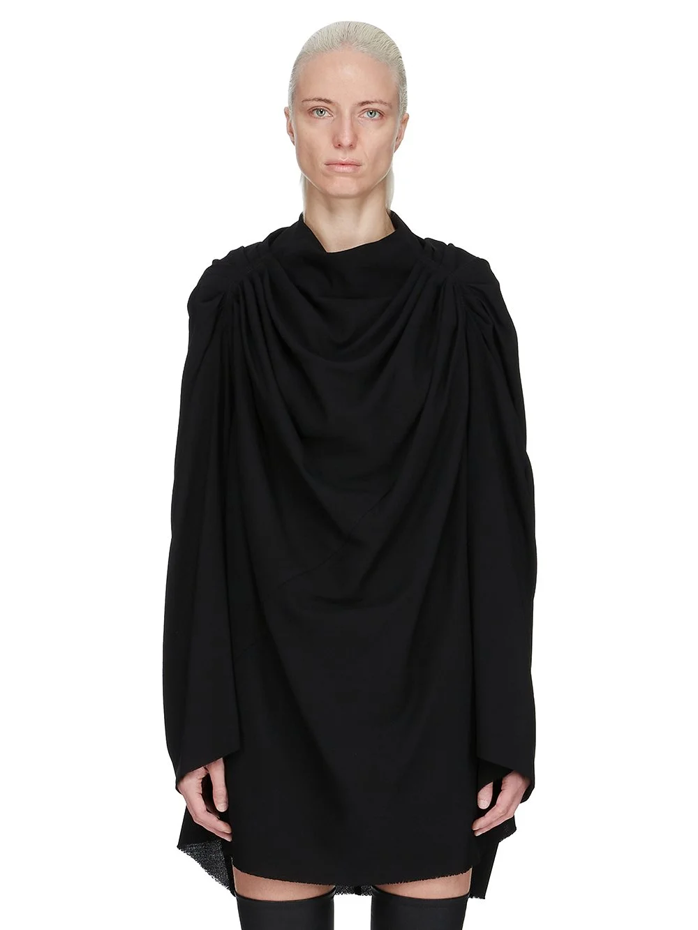 RICK OWENS FW25 CONCORDIANS RUNWAY CLAUDETTE MINI IN BLACK WOOL SABLE THIS CLAUDETTE MINI IS MID-THIGH LENGTH AT FRONT AND FALLS SLIGHTLY LONGER AT BACK. IT HAS LONG, WIDE SLEEVES AND SIDE OPENINGS SO THE ARM CAN BE WORN IN OR OUT. IT FEATURES A GATHERED, ROUNDED NECK, THAT CREATES MULTIPLE PLEATING AT THE SHOULDER, A BIAS CUT SEAM RUNNING ACROSS THE FRONT CHEST AND BACK, AND DRAPING AT FRONT AND BACK AND A ROUNDED AMPLE SHAPE AND A BUTTONED BACK NECK CLOSURE THIS MEDIUMWEIGHT WOOL SABLE FABRIC IS WOVEN WITH HIGH TWIST CREPE YARNS THAT CREATE A DRY HANDFEEL AND TEXTURED SURFACE. IT IS WOVEN IN THE BIELLA REGION OF ITALY RENOWNED FOR ITS LONG TRADITION OF TAILORED WOOL THIS FABRIC IS MADE FROM ZQ CERTIFIED VIRGIN WOOL WHICH ENSURES A HIGH STANDARD IN ANIMAL WELFARE, ENVIRONMENTAL SUSTAINABILITY AND SOCIAL RESPONSIBILITY. EACH BALE OF WOOL IS TRACEABLE BACK TO ITS SOURCE COLOR: BLACK MATERIAL: 100% NEW WOOL BUTTONS 100% BUFFALO HORNMODEL IS 181CM TALL MODEL WEARS SIZE 40