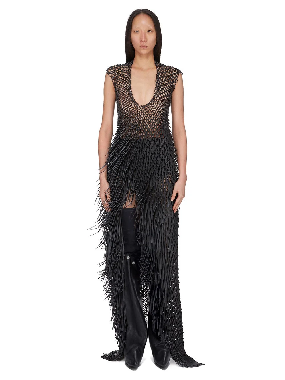 RICK OWENS FW25 CONCORDIANS RUNWAY VICTOR LONG DRESS IN BLACK GROPPONE COW LEATHER THIS VICTOR LONG DRESS IS FLOOR LENGTH AT FRONT AND BACK, TAPERING DOWN IN FRONT TO A POINT. IT HAS A DEEP V NECKLINE, IS SLEEVELESS AND IS FULLER THEREFORE LESS TRANSPARENT FROM RIGHT HIP DOWN. IT FEATURES HIGH SIDE SLIT ON LEFT. THIS HEAVYWEIGHT COW GROPPONE LEATHER HAS A FLAT AND MATTE SURFACE AND A RIGID HANDFEEL. THIS TANNERY IS LWG CERTIFIED WITH A GOLD RATING. COLOR: BLACK MATERIAL: 100% COW REAL FUR MODEL IS 181CM TALL ITEM IS AVAILABLE IN ONE SIZE