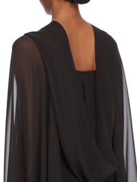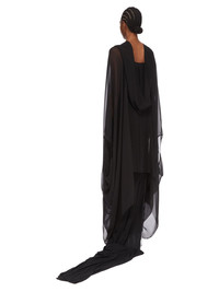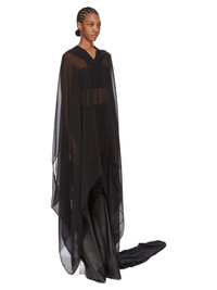 RICK OWENS SS25 HOLLYWOOD RUNWAY HOODED KAFTAN PULLOVER IN BLACK SILK CHIFFON THIS HOODED KAFTAN PULLOVER IS MID-THIGH LENGTH AT FRONT, DIPPING LOWER AT SIDES. IT HAS A LARGE HOOD WITH A V NECK AND A SEAM RUNNING DOWN THE CENTRE FRONT. IT IS A VOLUMINOUS KAFTAN SHAPE, WITH A WIDE SHOULDER THAT FALLS INTO A DROPPED ARMHOLE, EXPOSING THE HAND AT THE WRIST. IT FEATURES A GEO LINE, RUNNING ACROSS THE SHOULDER, AND THEN DIAGONALLY DOWN THE SIDE BODY THIS LIGHTWEIGHT AND SEMI-TRANSPARENT SILK CHIFFON IS FLUID WITH A MATTE SURFACE AND DRY HANDFEEL. IT IS WOVEN IN THE COMO REGION OF ITALY KNOWN FOR ITS HERITAGE OF SILK PRODUCTION THIS FABRIC IS MADE USING GOTS CERTIFIED ORGANIC SILK BECAUSE IT MEANS THE NATURAL FIBER IS MADE WITHOUT HARMFUL CHEMICALS, WHICH LEAVES OUR SOIL, AIR AND WATER CLEANER FROM CONTAMINATES COLOR: BLACK MATERIAL: 100% SILK MODEL IS 181CM TALL ITEM IS AVAILABLE IN ONE SIZE