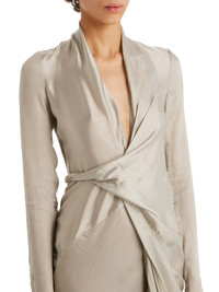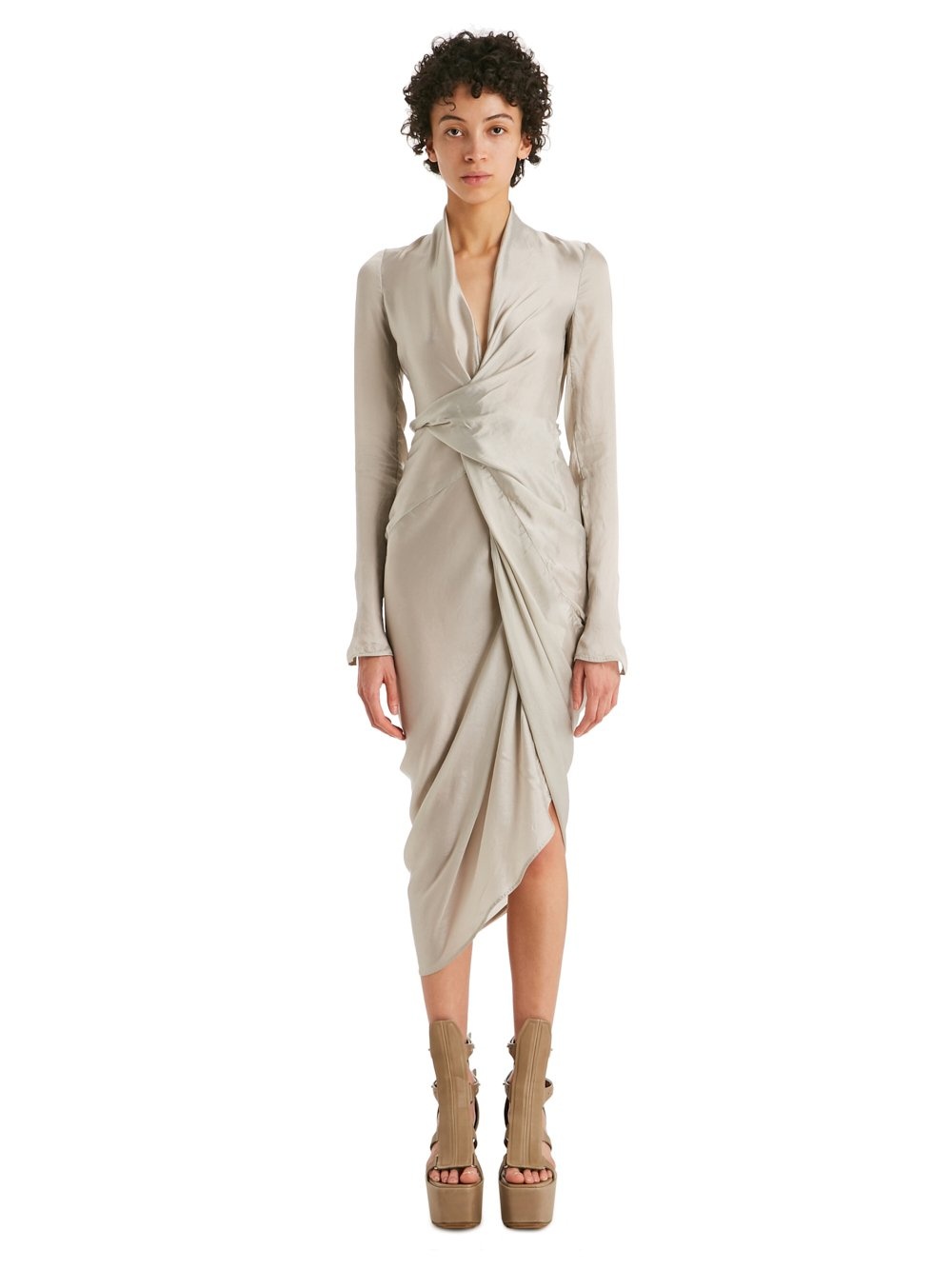 RICK OWENS FW22 STROBE WRAP DRESS IN PEARL CUPRO SATIN THIS WRAP DRESS IS MID-CALF LENGTH AT BACK AND SLIGHTLY SHORTER IN FRONT. IT IS A WRAP DRESS WHICH TIES WITH A BELT AT THE BACK, CREATING A V NECK AND A FRONT SPLIT, WITH DRAPING DETAILS AND PLEATS AROUND THE WAIST. IT HAS LONG SLEEVES WITH ZIPPERED CUFFS A DRAPEY AND SHINY CUPRO SATIN QUALITY. WE CHOSE CUPRO FOR THIS PRODUCT BECAUSE CUPRO FIBER IS BIODEGRADABLE AND 100% PLANT BASED. AS IT’S MADE FROM COTTON WASTE, CUPRO HELPS FIND A PURPOSE TO FIBERS THAT WOULD OTHERWISE BE DISCARDED - COLOR: PEARL - MATERIAL: 100% CUPRO - MODEL IS WEARING SIZE 40 - MODEL IS 181 CM TALL