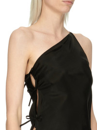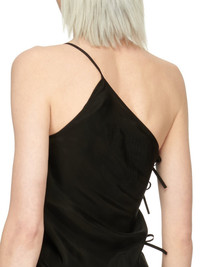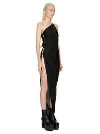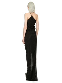 RICK OWENS FW23 LUXOR TACO GOWN IN BLACK CUPRO JAPONETTE THIS TACO GOWN TRAILS FLOOR LENGTH WITH AN ASYMMETRICAL NECKLINE AND ONE THIN SHOULDER STRAP. IT FEATURES AN OPEN RIGHT SIDE BODY, THAT SECURES WITH TIES ALL THE WAY DOWN TO THE HIP, WITH A SKIRT THAT TAPERS TO THE FLOOR THIS LIGHTWEIGHT JAPONETTE IS FLUID WITH A COOL HANDFEEL. THIS FABRIC IS MADE USING CUPRO WHICH IS BIODEGRADABLE AND 100% PLANT BASED. AS IT’S MADE FROM COTTON WASTE, CUPRO HELPS FIND A PURPOSE TO FIBERS THAT WOULD OTHERWISE BE DISCARDED - COLOR: BLACK - MATERIAL: 100% CUPRO - MODEL IS WEARING SIZE 40 - MODEL IS 181 CM TALL