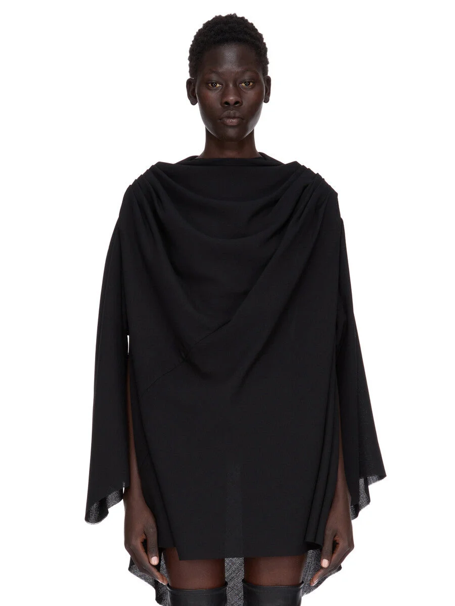 RICK OWENS FW25 CONCORDIANS CLAUDETTE MINI IN BLACK WOOL SABLE THIS CLAUDETTE MINI IS MID-THIGH LENGTH AT FRONT AND FALLS SLIGHTLY LONGER AT BACK. IT HAS LONG, WIDE SLEEVES AND SIDE OPENINGS SO THE ARM CAN BE WORN IN OR OUT. IT FEATURES A GATHERED, ROUNDED NECK, THAT CREATES MULTIPLE PLEATING AT THE SHOULDER, A BIAS CUT SEAM RUNNING ACROSS THE FRONT CHEST AND BACK, AND DRAPING AT FRONT AND BACK AND A ROUNDED AMPLE SHAPE AND A BUTTONED BACK NECK CLOSURE. THIS MEDIUMWEIGHT WOOL SABLE FABRIC IS WOVEN WITH HIGH TWIST CREPE YARNS THAT CREATE A DRY HANDFEEL AND TEXTURED SURFACE. IT IS WOVEN IN THE BIELLA REGION OF ITALY RENOWNED FOR ITS LONG TRADITION OF TAILORED WOOL. THIS FABRIC IS MADE FROM ZQ CERTIFIED VIRGIN WOOL WHICH ENSURES A HIGH STANDARD IN ANIMAL WELFARE, ENVIRONMENTAL SUSTAINABILITY AND SOCIAL RESPONSIBILITY. EACH BALE OF WOOL IS TRACEABLE BACK TO ITS SOURCE. COLOR: BLACK MATERIAL: 100% NEW WOOL BUTTONS 100% BUFFALO HORN MODEL IS 181CM TALL MODEL WEARS SIZE 40