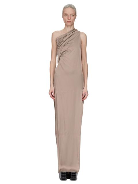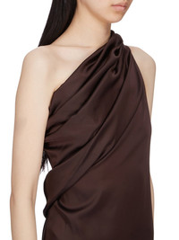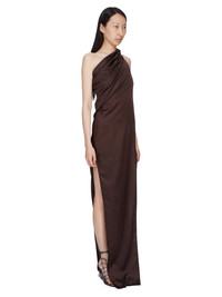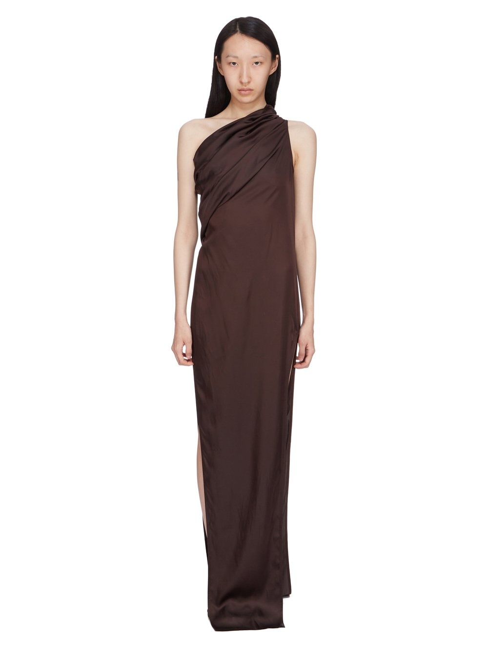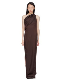 RICK OWENS SS25 HOLLYWOOD ATHENA ARROWHEAD IN MAHOGANY WASHED CHARMEUSE THIS ATHENA ARROWHEAD IS FLOOR-LENGTH. IT HAS ONE RIGHT SHOULDER WITH AN ASYMMETRICAL NECKLINE THAT DRAPES ACROSS THE BODY. IT FEATURES A SKIRT WITH TWO HIGH SIDE SLITS WHICH TAPERS SLIGHTLY TO THE FLOOR WITH A CENTER BACK SEAM THIS LIGHTWEIGHT AND FLUID CHARMEUSE HAS A SEMI-SHINY SURFACE AND WASHED FINISH. THIS FABRIC IS MADE FROM CERTIFIED VISCOSE WHICH ENSURES THAT THE FIBERS ARE PRODUCED FROM RESPONSIBLY MANAGED SOURCES AND NO DEFORESTATION OCCURS COLOR: MAHOGANY MATERIAL: 61% ACETATE + 39% VISCOSE MODEL IS 181CM TALL MODEL WEARS SIZE 38