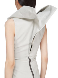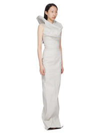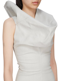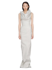 RICK OWENS SS25 HOLLYWOOD WINGED GOWN IN DINGE COATED STRETCH DENIM THIS WINGED GOWN IS FLOOR-LENGTH AND HAS A CLOSE TO THE BODY FIT. IT FEATURES A FRONT NECK THAT DRAPES ACROSS THE CHEST AND RISES UP AT THE BACK, BEHIND THE HEAD, IN TWO WINGED POINTS AND A SKIRT THAT TAPERS TO THE FLOOR. IT HAS SEAMS RUNNING DOWN THE CENTER FRONT AND BACK WITH A REAR SPLIT, FINISHING AT MID-THIGH. IT SECURES WITH A CENTER BACK ZIPPER THIS LIGHTWEIGHT STRETCH DENIM IS COVERED WITH A SEMI-SHINY AND SOFT COATING. THE INDIGO COLOR AND STRUCTURE OF THE DENIM SHINES THROUGH THE COLOR OF THE COATING CREATING A MULTILAYERED AND IRREGULAR COLORATION. THE NATURAL ASPECTS OF THIS FABRIC MEANS THE COATING HAS PEELED OFF IN CERTAIN AREAS, EXPOSING THE UNDERLAYING MATERIAL AND WILL CONTINUE TO DO SO WITH WEAR AND ABRASION. THIS IS AN INHERENT CHARACTERISTIC OF THIS TYPE OF TREATMENT AND IS A DESIRED A VISUAL ASPECT WHICH ADDS TO THE UNIQUENESS OF EACH PIECE AND SHOULD NOT BE CONSIDERED A DEFECT THIS FABRIC IS MADE USING OCS CERTIFIED ORGANIC COTTON WHICH MEANS THE NATURAL FIBER IS GROWN WITHOUT HARMFUL CHEMICALS, LEAVING OUR SOIL, AIR AND WATER CLEANER FROM CONTAMINATES COLOR: DINGE MATERIAL: 91% COTTON + 6% ELASTOMULTIESTER + 3% RUBBER MODEL IS 181CM TALL MODEL WEARS SIZE 38
