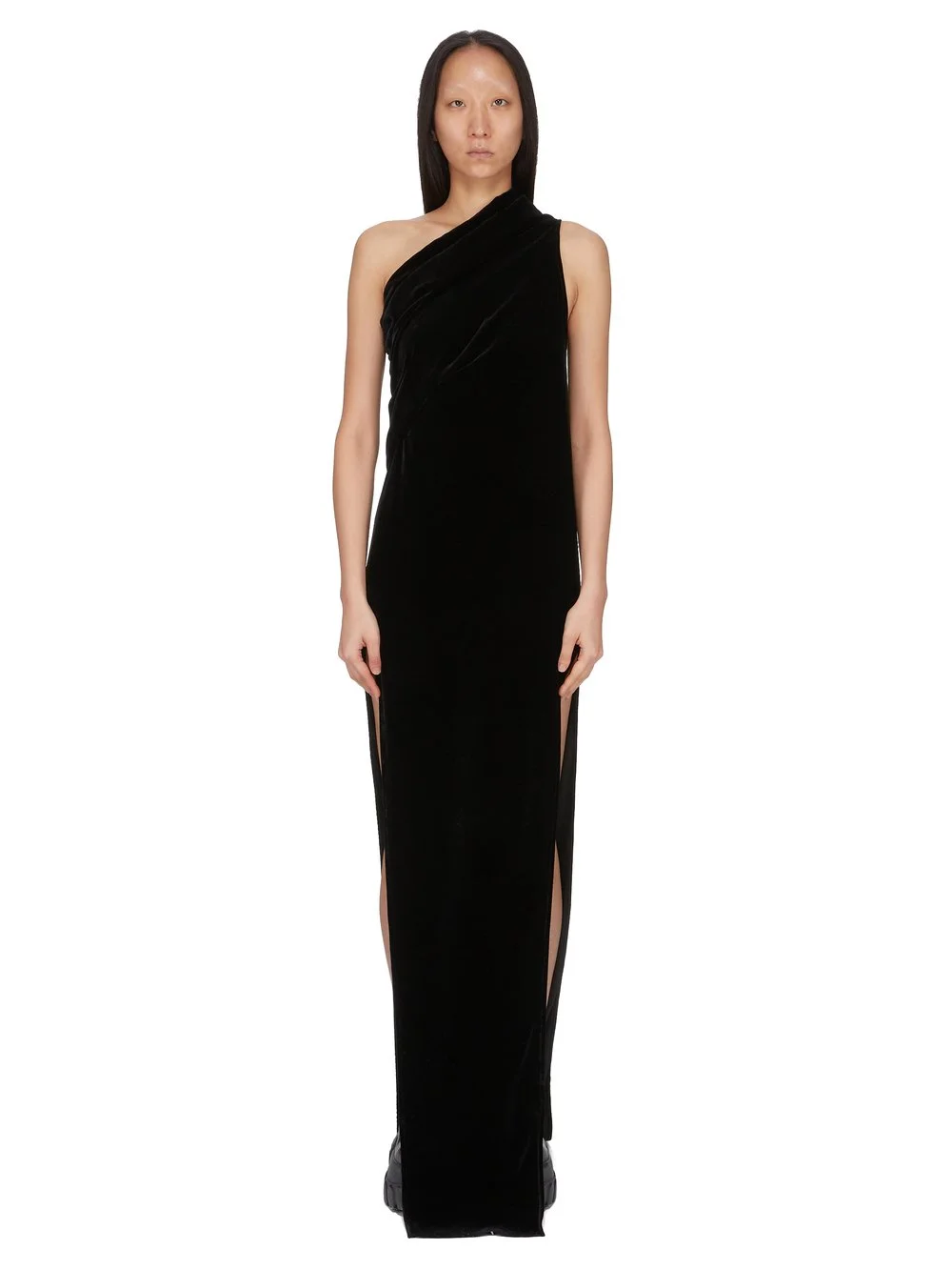 RICK OWENS FW25 CONCORDIANS ATHENA ARROWHEAD GOWN IN BLACK VELVET THIS ATHENA ARROWHEAD GOWN IS FLOOR LENGTH. IT HAS ONE RIGHT SHOULDER WITH AN ASYMMETRICAL NECKLINE THAT DRAPES ACROSS THE BODY. IT FEATURES A SKIRT WITH TWO HIGH SIDE SLITS WHICH TAPERS SLIGHTLY TO THE FLOOR WITH A CENTRE BACK SEAM THIS LIGHTWEIGHT AND FLUID VELVET HAS A SOFT AND WASHED UNEVEN FINISH. THIS FABRIC IS MADE FROM CERTIFIED VISCOSE WHICH ENSURES THAT THE FIBERS ARE PRODUCED FROM RESPONSIBLY MANAGED SOURCES AND NO DEFORESTATION OCCURS COLOR: BLACK MATERIAL: 82% VISCOSE + 18% SILK MODEL IS 181CM TALL MODEL WEARS SIZE 40