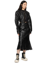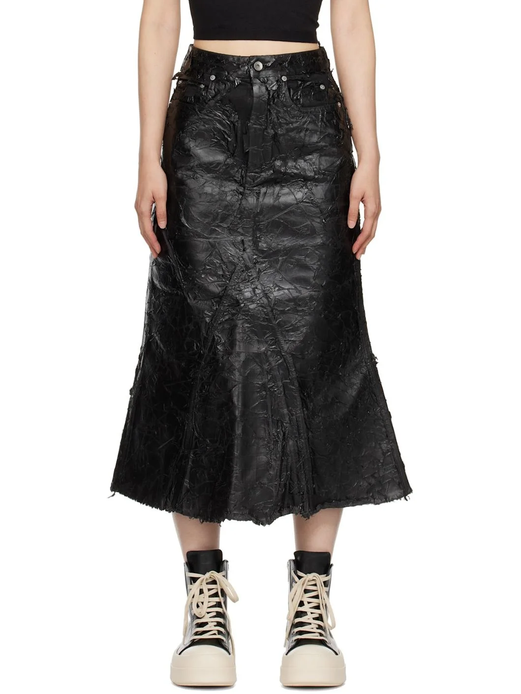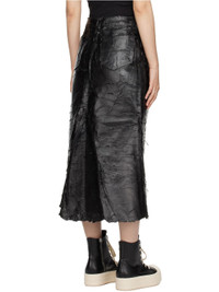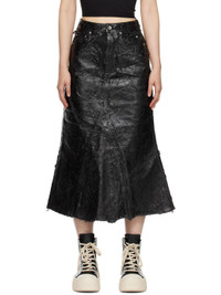 Foil-coated wax non-stretch denim midi skirt. · Belt loops · Six-pocket styling · Zip-fly · Raw edge at flared godet hem Supplier color: Black Body: 100% cotton. Lining: 52% polyester, 48% cotton. Made in Italy 242126F092002
