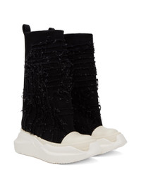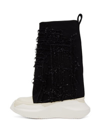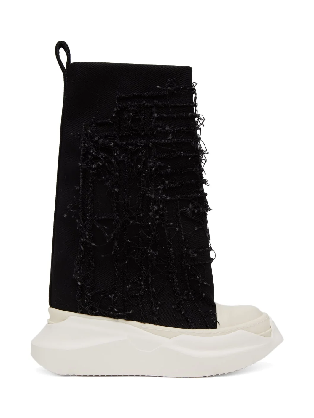 Mid-calf non-stretch denim boots in black. Denim appliqués and loose thread detailing throughout. · Round calfskin cap toe · Pull-loop at heel collar · Grained calfskin lining · Sculptural rubber platform midsole · Treaded rubber outsole · Platform: H2.25 in Supplier color: Black/Milk/Milk