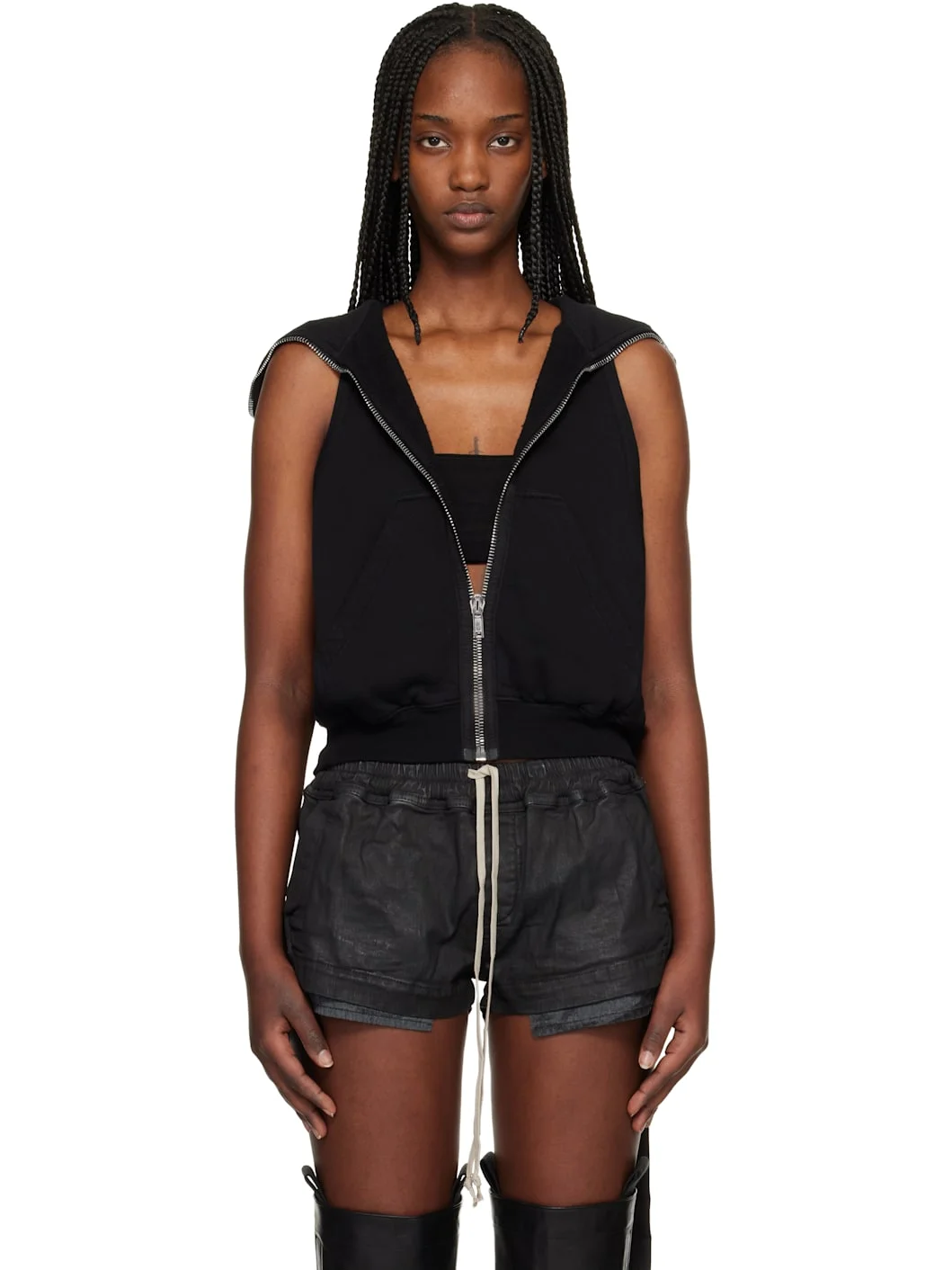Heavyweight brushed organic cotton fleece vest-style hoodie. · Garment-dyed · GOTS-certified organic cotton · Zip closure extends to hood · Patch pockets at waist · Rib-knit hem · Dropped armscyes · Logo-woven strap at interior Supplier color: Black 100% organic cotton. Made in Italy 261126F097006