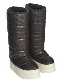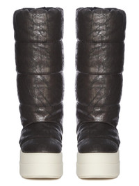 DRKSHDW FW25 CONCORDIANS MEGA BUMPER KNEE HIGH LUNAR IN BRONZE/MILK 13OZ MEGACRUST DENIM THESE MEGA BUMPER KNEE HIGH LUNAR ARE BELOW-KNEE HEIGHT. THEY HAVE A SOFT PADDED PULL ON BOOT UPPER WITH QUILTED STITCHED PANELS AND FEATURE DOUBLE HEIGHT, SHARK TOOTH MEGA BUMPER SOLES. THIS MEDIUMWEIGHT BRONZE MEGACRUST DENIM IS MADE ON A 13OZ JAPANESE BLACK AND NATURAL DENIM. THE READY GARMENT IS OVERDYED DRKDUST AND THEN TREATED WITH LAYERS OF BRONZE COLORED FOIL THAT IS PRESSED ON BY HAND THE NATURAL ASPECTS OF THIS TREATMENT MEANS THE FOIL APPLICATION IS IRREGULAR AND HAS PEELED OFF AND CRACKED IN CERTAIN AREAS AND WILL CONTINUE TO DO SO WITH WEAR AND ABRASION. THIS IS AN INHERENT CHARACTERISTIC OF THIS TYPE OF TREATMENT AND IS A DESIRED VISUAL ASPECT WHICH ADDS TO THE UNIQUENESS OF EACH PIECE THIS GARMENT IS TREATED IN AN ITALIAN WASH HOUSE BASED IN THE VENETO AREA OF ITALY, THAT PRODUCES IN SMALLER TREATMENT BATHS TO REDUCE WATER WASTE AND UTILIZE A WATER PURIFYING PROCESS THAT ENABLES THEM TO RECYCLE A PORTION OF THE WATER USED. ALL OF OUR DENIM WASHES ARE ZDHC CERTIFIED COLOR: BRONZE/MILK MATERIAL: UPPER 100% COTTON LINING 100% NYLON PADDING 70% POLYURETHANE + 30% POLYESTER SOLE HEIGHT 6.5CM
