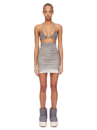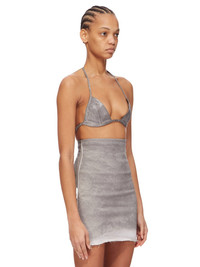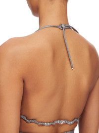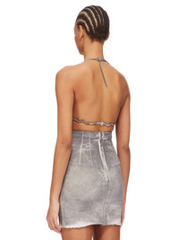 DRKSHDW FW24 PORTERVILLE BRA IN PEARL FOIL STRETCH DENIM THIS BRA IS A TRIANGLE SHAPE WITH THIN STRAPS THAT RUN ACROSS THE BACK AND TIE TO SECURE, HALTER STYLE, BEHIND THE BACK NECK THIS LIGHTWEIGHT STRETCH DENIM IS OVERDYED WITH A CLEAR FOIL OVERLAY THAT CREATES THE WAXY TOUCH SINCE THE FOIL IS PRESSED ON TOP OF THE FINAL GARMENTS, EACH PIECE WILL HAVE ITS OWN UNIQUE LOOK AND CREASES SINCE THE FOIL WILL ATTACH TO DIFFERENT PLACES DEPENDING ON THE GARMENT. THIS GARMENT IS TREATED IN AN ITALIAN WASH HOUSE BASED IN THE VENETO AREA OF ITALY, THAT PRODUCES IN SMALLER TREATMENT BATHS TO REDUCE WATER WASTE AND UTILIZE A WATER PURIFYING PROCESS THAT ENABLES THEM TO RECYCLE A PORTION OF THE WATER USED. ALL OF OUR DENIM WASHES ARE ZDHC CERTIFIED - COLOR: PEARL - MATERIAL: 85% COTTON + 10% POLYESTER + 5% ELASTANE - LINING 100% COTTON - MODEL IS 181CM TALL - MODEL WEARS SIZE S