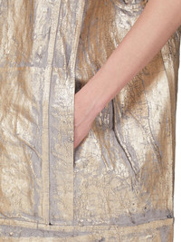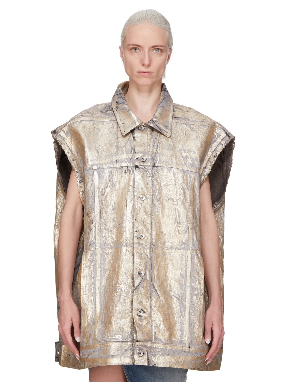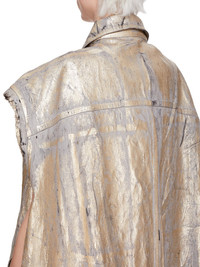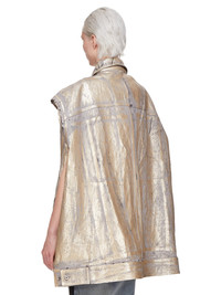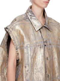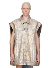 RICK OWENS SS25 HOLLYWOOD SL JUMBO WORKER JKT IN 13OZ GOLD MEGACRUST DENIM THIS SL JUMBO WORKER JACKET IS BELOW HIP LENGTH, JUMBO OVERSIZED AND SLEEVELESS. IT FEATURES A CENTRE FRONT PLACKET WITH VISIBLE BUTTONS AND A CLASSIC COLLAR. IT HAS A WAISTBAND HEM WITH BUTTON DETAIL, SIDE POCKETS, AND DOUBLE TOP STITCHING ON ALL SEAMS. IT HAS TWO INTERNAL POCKETS THIS MEDIUMWEIGHT GOLD MEGACRUST DENIM IS MADE ON A 13OZ JAPANESE BLACK AND NATURAL DENIM. THE READY GARMENT IS OVERDYED DUST AND THEN TREATED WITH LAYERS OF GOLD COLORED FOIL THAT IS PRESSED ON BY HAND. THE NATURAL ASPECTS OF THIS TREATMENT MEANS THE FOIL APPLICATION IS IRREGULAR AND HAS PEELED OFF AND CRACKED IN CERTAIN AREAS AND WILL CONTINUE TO DO SO WITH WEAR AND ABRASION. THIS IS AN INHERENT CHARACTERISTIC OF THIS TYPE OF TREATMENT AND IS A DESIRED A VISUAL ASPECT WHICH ADDS TO THE UNIQUENESS OF EACH PIECE. THIS GARMENT IS TREATED IN AN ITALIAN WASH HOUSE BASED IN THE VENETO AREA OF ITALY, THAT PRODUCES IN SMALLER TREATMENT BATHS TO REDUCE WATER WASTE AND UTILIZE A WATER PURIFYING PROCESS THAT ENABLES THEM TO RECYCLE A PORTION OF THE WATER USED. ALL OF OUR DENIM WASHES ARE ZDHC CERTIFIED COLOR: GOLD MATERIAL: 100% COTTON MODEL IS 181CM TALL MODEL WEARS SIZE M