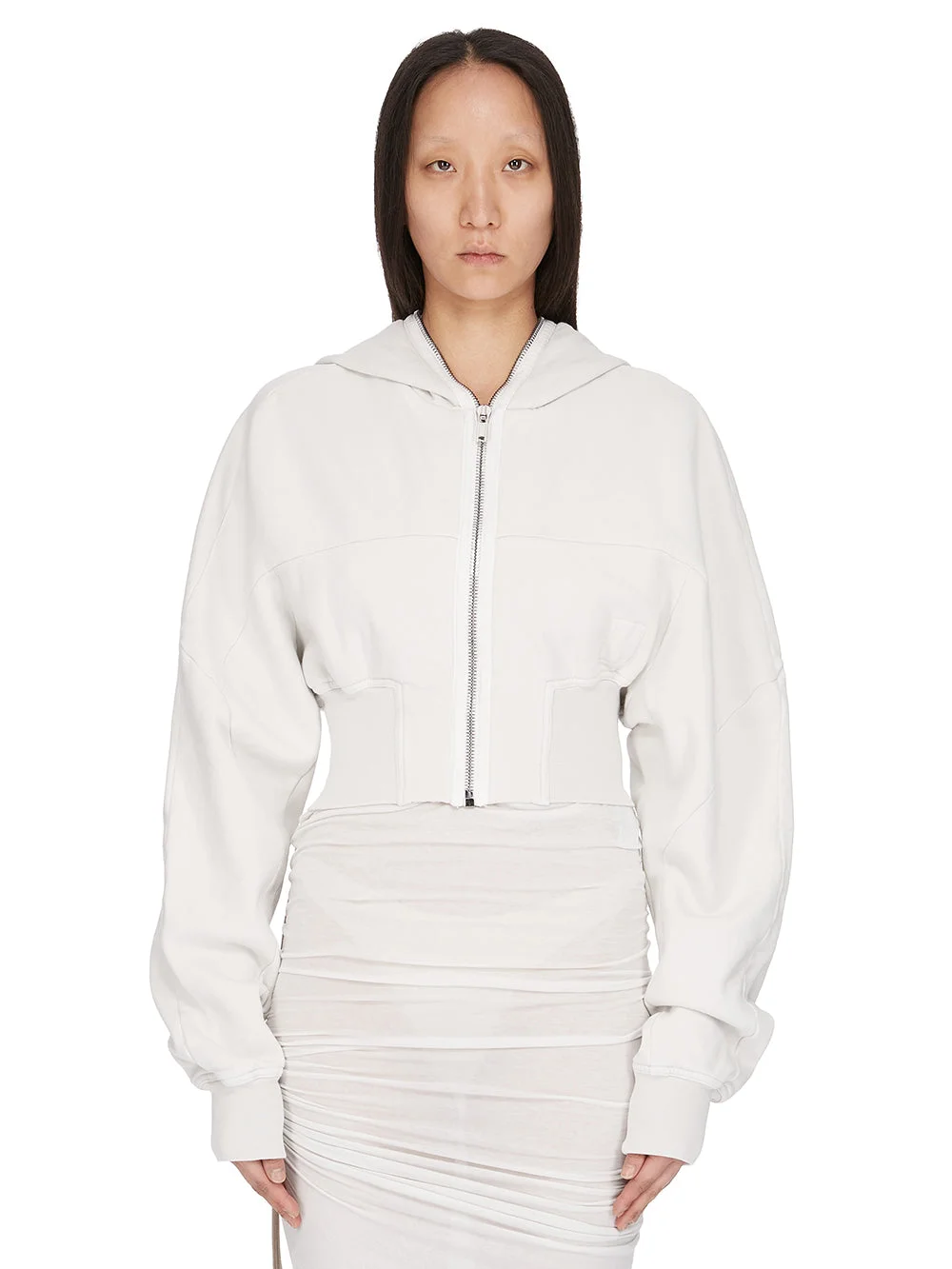 DRKSHDW SS26 TEMPLE COLLAGE GIMP HOODIE IN MILK FURKA HEAVY SWEATSHIRT JERSEY THIS COLLAGE GIMP HOODIE IS CROPPED WAIST LENGTH AND HAS LONG SLEEVES. IT HAS A FRONT ZIPPER CLOSURE WITH EXPOSED ZIPPER TAPE THAT RUNS FROM THE HEM ALL THE WAY UP THROUGH THE HOOD, ALLOWING IT TO BE ZIPPERED COMPLETELY CLOSED OVER THE FACE. IT FEATURES GEOMETRIC GIRDERED SHOULDERS AND STITCHING, A FRONT AND BACK YOKE AND HAS RIBBED CUFFS AND WIDE WAISTBAND. THIS HEAVYWEIGHT COTTON SWEATSHIRT JERSEY HAS A SOFT AND WASHED HANDFEEL. THIS JERSEY IS GARMENT DYED. THIS FABRIC IS MADE USING GOTS CERTIFIED ORGANIC COTTON WHICH MEANS THE NATURAL FIBER IS GROWN WITHOUT HARMFUL CHEMICALS, LEAVING OUR SOIL, AIR AND WATER CLEANER FROM CONTAMINATES. COLOR: MILK MATERIAL:100% COTTON MODEL IS 181CM TALL MODEL WEARS SIZE S