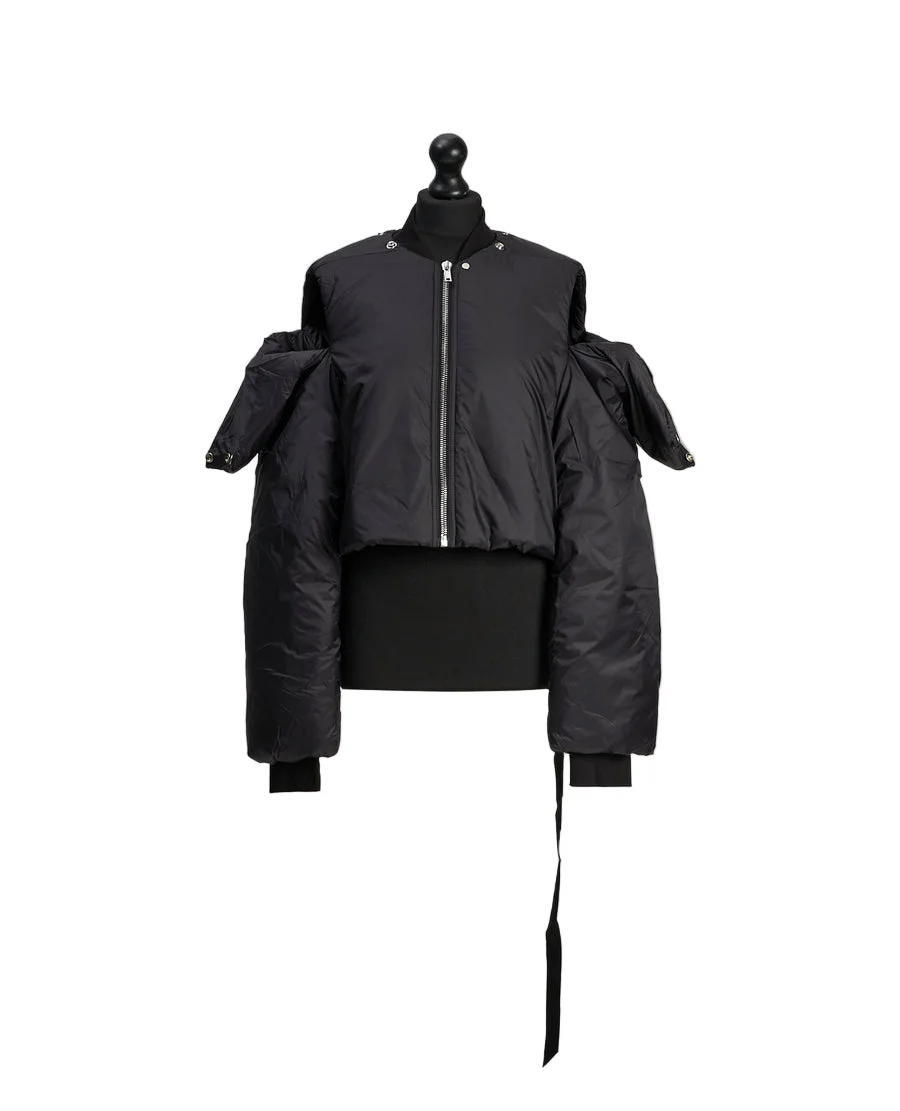 The Convertible Jacket in black by DRKSHDW, designed by Rick Owens, showcases the brand's signature avant-garde approach. It is crafted from lightweight recycled nylon and has a cropped waist-length silhouette. The jacket has long sleeves, a central front zipper, and a removable high funnel collar with snap fastenings. Once detached, the collar reveals a ribbed edge and visible snaps. Additional functional details include shoulder snaps, internal snap pockets, and a cotton webbing strap across the back. This piece is fully lined and made in Italy using sustainable materials certified by GRS. Material: 100% Polyamide Color: Black Made in Italy Sku: DS02E7727NP/09