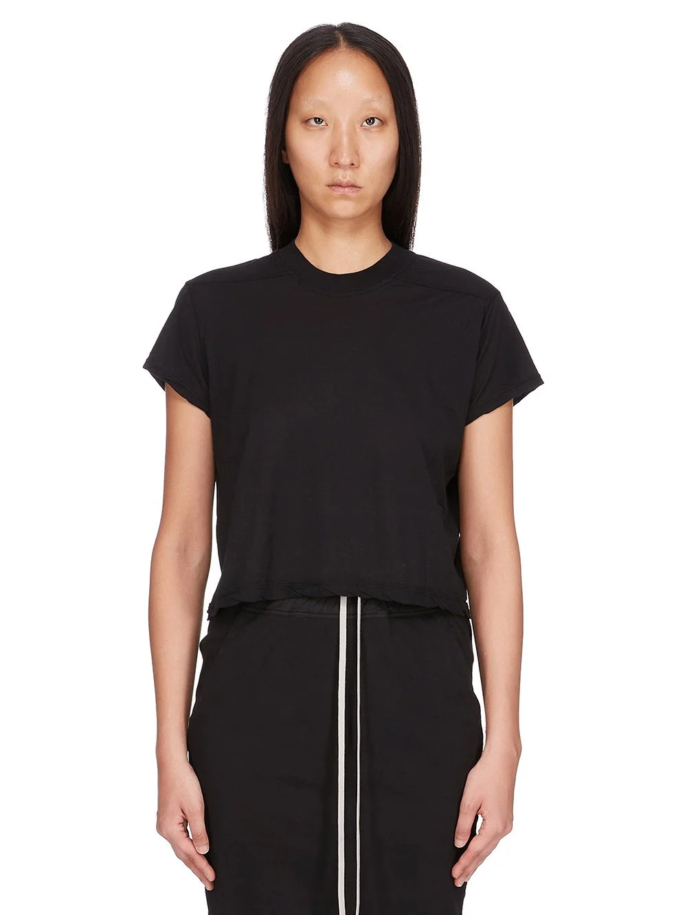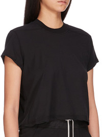 DRKSHDW FW25 CONCORDIANS CROPPED SMALL LEVEL T IN BLACK COTTON GAUZE JERSEY THIS CROPPED SMALL LEVEL T IS ABOVE HIP LENGTH WITH A SEMI-FITTED CUT, SHORT SLEEVES AND A RIBBED CREW NECK. IT FEATURES SIGNATURE FRONT LEVEL SHOULDER SEAMS AND A CENTRE BACK SEAM. THIS LIGHTWEIGHT AND AIRY COTTON GAUZE JERSEY IS SEMI TRANSPARENT AND HAVE A SOFT WASHED HANDFEEL. THIS JERSEY IS GARMENT DYED THIS FABRIC IS MADE USING GOTS CERTIFIED ORGANIC COTTON WHICH MEANS THE NATURAL FIBER IS GROWN WITHOUT HARMFUL CHEMICALS, LEAVING OUR SOIL, AIR AND WATER CLEANER FROM CONTAMINATES COLOR: BLACK MATERIAL: 100% COTTON MODEL IS 181CM TALL MODEL WEARS SIZE S