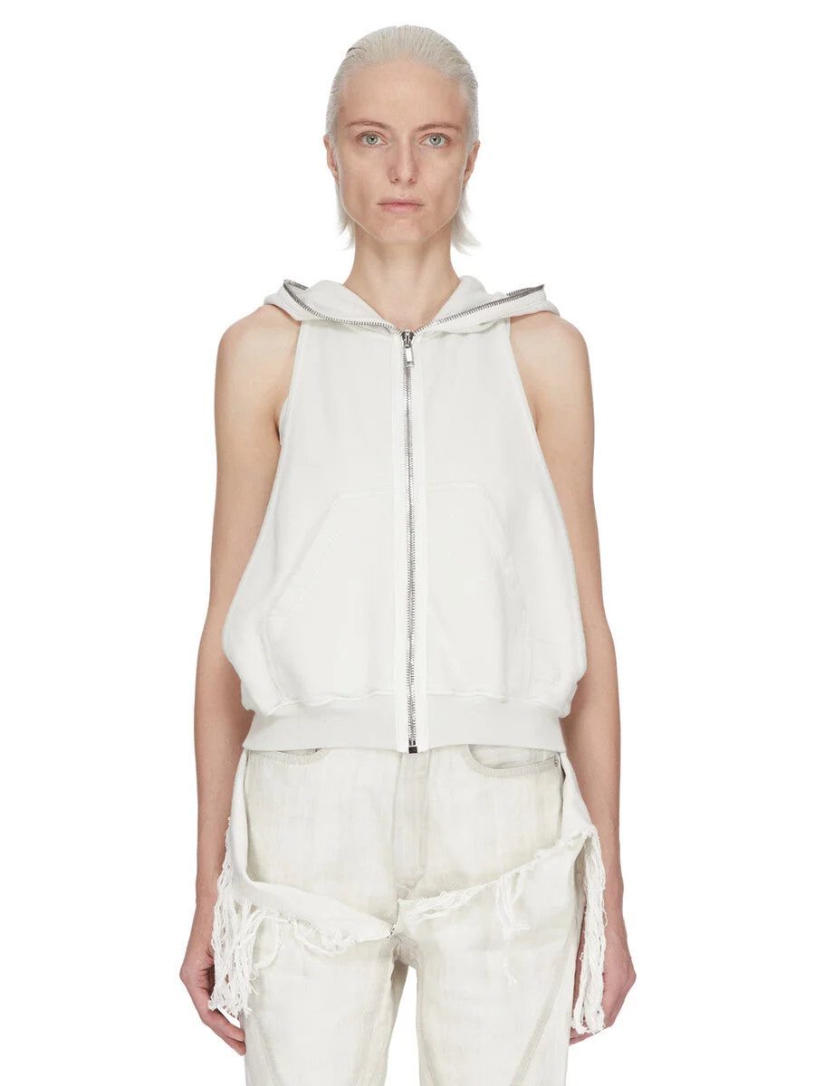 DRKSHDW SS26 TEMPLE CYCLOPS GIMP SL HOODIE IN MILK WASH FURKA HEAVY SWEATSHIRT JERSEY THIS CYCLOPS GIMP SL HOODIE IS ABOVE HIP LENGTH AND IS SLEEVELESS. IT FEATURES VERY LOW SCOOPED ARMHOLES, REVEALING THE SIDE BODY. IT HAS A FRONT ZIPPER CLOSURE WITH EXPOSED ZIPPER TAPE THAT RUNS FROM THE HEM ALL THE WAY UP THROUGH THE HOOD, ALLOWING IT TO BE ZIPPERED COMPLETELY CLOSED OVER THE FACE. IT HAS TWO SIDE FRONT POCKETS, RIBBED CUFFS AND HEM, AND A SINGLE SEAM RUNNING DOWN THE CENTRE BACK SPINE. THIS HEAVYWEIGHT COTTON SWEATSHIRT JERSEY HAS A SOFT AND WASHED HANDFEEL. THIS JERSEY IS GARMENT DYED. THIS FABRIC IS MADE USING GOTS CERTIFIED ORGANIC COTTON WHICH MEANS THE NATURAL FIBER IS GROWN WITHOUT HARMFUL CHEMICALS, LEAVING OUR SOIL, AIR AND WATER CLEANER FROM CONTAMINATES. COLOR: MILK WASH MATERIAL:100% COTTON MODEL IS 181CM TALL MODEL WEARS SIZE S
