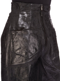 DRKSHDW FW24 PORTERVILLE DIRT COOPER IN BLACK 13OZ MEGACRUST DENIM THESE DIRT COOPER TROUSERS ARE FULL LENGTH, WITH A WIDE FIT AND A REGULAR CROTCH. THEY ARE A 5 POCKET JEAN WITH RIVETS, REAR PATCH POCKETS AND TOPSTITCHINGTHEY FEATURE AN EXTRA HIGH DIRT WAIST THAT CLOSES WITH A CENTRE BACK ZIPPER. THIS MEDIUMWEIGHT MEGACRUST DENIM IS MADE ON A 13OZ BLACK AND NATURAL JAPANESE DENIM. THE READY GARMENT IS OVERDYED BLACK AND TREATED WITH A WAX FINISH, THEN SEVERAL LAYERS OF BLACK FOIL IS PRESSED ON TOP AND A FINAL WASH MAKES THE FOIL PEEL AND CRACK. THE NATURAL ASPECTS OF THIS TREATMENT MEANS THE FOIL HAS PEELED OFF AND CRACKED IN CERTAIN AREAS AND WILL CONTINUE TO DO SO WITH WEAR AND ABRASION. THIS IS AN INHERENT CHARACTERISTIC OF THIS TYPE OF TREATMENT AND IS A DESIRED A VISUAL ASPECT WHICH ADDS TO THE UNIQUENESS OF EACH PIECE. THIS GARMENT IS TREATED IN AN ITALIAN WASH HOUSE BASED IN THE VENETO AREA OF ITALY, THAT PRODUCES IN SMALLER TREATMENT BATHS TO REDUCE WATER WASTE AND UTILIZE A WATER PURIFYING PROCESS THAT ENABLES THEM TO RECYCLE A PORTION OF THE WATER USED. ALL OF OUR DENIM WASHES ARE ZDHC CERTIFIED - COLOR: BLACK - MATERIAL: 100% COTTON - POCKETS LINING 52% POLYESTER + 48% COTTON - MODEL IS 181CM TALL - MODEL WEARS SIZE M