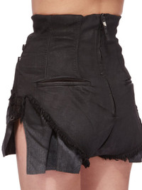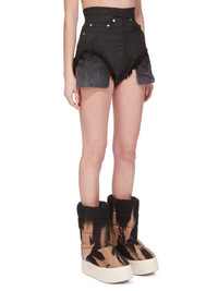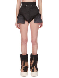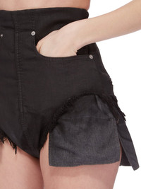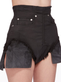 DRKSHDW FW24 PORTERVILLE DIRT CUT OFFS IN BLACK WAX BLACK WAX STRETCH DENIM THESE DIRT CUT OFFS ARE CUT HIGH ON THE HIP, WITH A TIGHT FIT. THEY HAVE AN EXTRA HIGH WAIST, FRONT JEAN POCKETS WITH RIVETS, BACK JET POCKETS AND POCKET BAG LININGS THAT HANG BELOW THE RAW CUT HEMS, FRONT AND BACK. THEY HAVE DOUBLE TOPSTITCHED DENIM SEAMS AND OPEN WITH A CENTRE BACK ZIPPER THIS LIGHTWEIGHT STRETCH DENIM IS OVERDYED AND THEN SPRAYED WITH A SOFT BLACK WAX FINISH THIS GARMENT IS TREATED IN AN ITALIAN WASH HOUSE BASED IN THE VENETO AREA OF ITALY, THAT PRODUCES IN SMALLER TREATMENT BATHS TO REDUCE WATER WASTE AND UTILIZE A WATER PURIFYING PROCESS THAT ENABLES THEM TO RECYCLE A PORTION OF THE WATER USED. ALL OF OUR DENIM WASHES ARE ZDHC CERTIFIED - COLOR: BLACK WAX - MATERIAL: 91% COTTON + 6% ELASTOMULTIESTER + 3% RUBBER - POCKETS LINING 52% POLYESTER + 48% COTTON - MODEL IS 181CM TALL - MODEL WEARS SIZE S