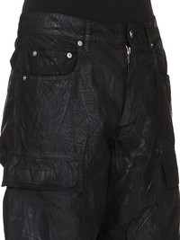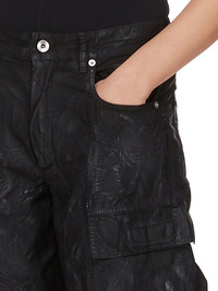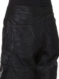 DRKSHDW SS25 HOLLYWOOD DOUBLE CARGO JEANS IN BLACK FOIL COTTON POPLIN THESE DOUBLE CARGO JEANS ARE A FULL LENGTH 5-POCKET JEAN WITH A LOW-RISE AND A LOOSE FIT. THEY HAVE A CONCEALED SILVER ZIP FLY, BELT LOOPS AND POCKET RIVETS AND THEY FEATURE TWO BEVELED CARGO POCKETS ON THE THIGH, WITH TWO SQUARE CARGO POCKETS BELOW, AND TWO SQUARE BACK POCKETS, ALL HAVE FLAPS AND TOPSTITCHING THIS LIGHTWEIGHT POPLIN HAS A SOFT HANDFEEL AND WASHED FINISH. THIS GARMENT HAS BEEN GARMENT DYED AND HAS A CLEAR, SEMI SHINY FOIL OVERLAY THAT CREATES A WAXY TOUCH SINCE THE FOIL IS PRESSED ON TOP OF THE FINAL GARMENTS, EACH PIECE WILL HAVE ITS OWN UNIQUE LOOK AND CREASES SINCE THE FOIL WILL ATTACH TO DIFFERENT PLACES DEPENDING ON THE GARMENT THIS FABRIC IS MADE USING GOTS CERTIFIED ORGANIC COTTON WHICH MEANS THE NATURAL FIBER IS GROWN WITHOUT HARMFUL CHEMICALS, LEAVING OUR SOIL, AIR AND WATER CLEANER FROM CONTAMINATES COLOR: BLACK MATERIAL: 100% COTTON MODEL IS 181CM TALL MODEL WEARS SIZE 26
