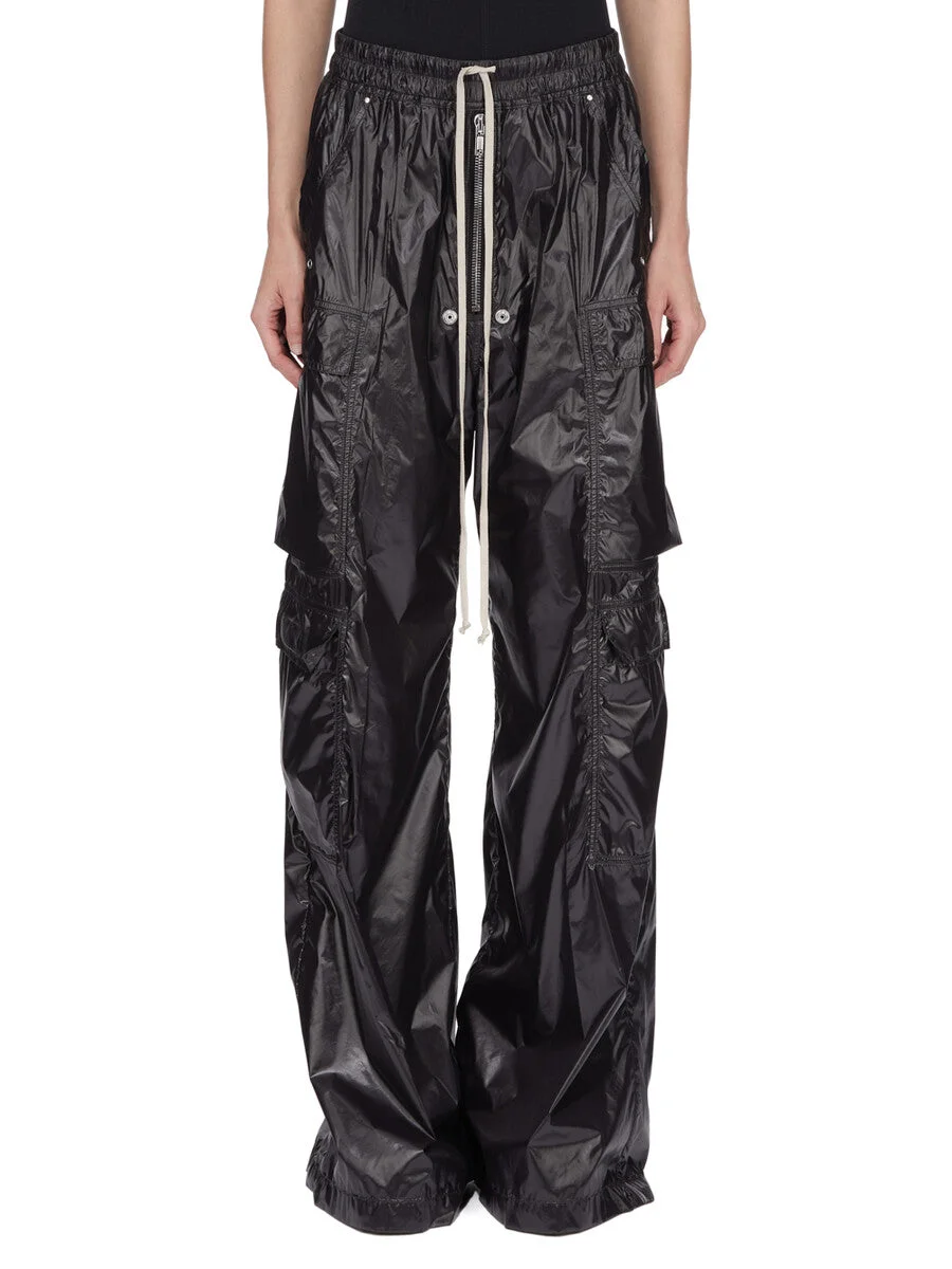 DRKSHDW SS26 TEMPLE DOUBLE CARGO JUMBO BELAS IN BLACK SHINY LIGHT NYLON THESE DOUBLE CARGO JUMBO BELA PANTS ARE FULL-LENGTH WITH A LOW CROTCH AND WIDE LEG. THEY FEATURE AN ELASTICIZED WAISTBAND WITH DRAWSTRING AND A BELA EXPOSED CENTER ZIPPER WITH TWO SNAP DETAIL AND SIDE WELT POCKETS WITH RIVETS. THEY FEATURE TWO BEVELED CARGO POCKETS ON THE THIGH, WITH TWO SQUARE CARGO POCKETS BELOW AND TWO SQUARE BACK POCKETS. THEY ALL HAVE FLAPS AND TOPSTITCHING. THIS AIRY AND LIGHTWEIGHT NYLON IS MADE USING GRS CERTIFIED RECYCLED NYLON WHICH ENSURES A REDUCTION IN WATER CONSUMPTION, EMISSIONS AND HAZARDOUS WASTE, LESSENING THE DEPENDENCE ON NON-RENEWABLE RESOURCES. COLOR: BLACK MATERIAL:100% NYLON MODEL IS 181CM TALL MODEL WEARS SIZE S