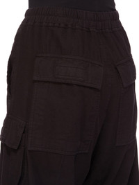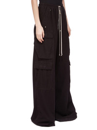 DRKSHDW FW24 PORTERVILLE DOUBLE CARGO JUMBO BELAS IN BLACK LIGHT FLANNEL THESE DOUBLE CARGO JUMBO BELA PANTS ARE FULL-LENGTH, WITH A LOW CROTCH AND WIDE LEG. THEY FEATURE AN ELASTICIZED WAISTBAND WITH DRAWSTRING AND A BELA EXPOSED CENTER ZIPPER WITH TWO SNAP DETAIL AT BOTTOM, AND SIDE WELT POCKETS WITH RIVETS. THEY FEATURE TWO BEVELED CARGO POCKETS ON THE THIGH, WITH TWO SQUARE CARGO POCKETS BELOW, AND TWO SQUARE BACK POCKETS, ALL HAVE FLAPS AND TOPSTITCHING THIS LIGHTWEIGHT COTTON FLANNEL FABRIC IS GARMENT DYED WITH A SOFT AND BRUSHED HANDFEEL. THIS FABRIC IS MADE USING GOTS CERTIFIED ORGANIC COTTON WHICH MEANS THE NATURAL FIBER IS GROWN WITHOUT HARMFUL CHEMICALS, LEAVING OUR SOIL, AIR AND WATER CLEANER FROM CONTAMINATES - COLOR: BLACK - MATERIAL: 100% COTTON - MODEL IS 181CM TALL - MODEL WEARS SIZE S