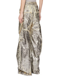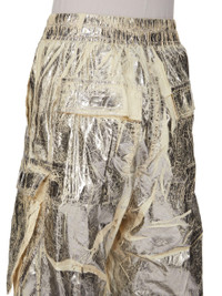 DRKSHDW FW25 CONCORDIANS DOUBLE CARGO JUMBO BELAS IN PALLADIUM FOIL LIGHT NYLON THESE DOUBLE CARGO JUMBO BELA PANTS ARE FULL-LENGTH WITH A LOW CROTCH AND WIDE LEG. THEY FEATURE AN ELASTICIZED WAISTBAND WITH DRAWSTRING AND A BELA EXPOSED CENTER ZIPPER WITH TWO SNAP DETAIL, AND SIDE WELT POCKETS WITH RIVETS. THEY FEATURE TWO BEVELED CARGO POCKETS ON THE THIGH, WITH TWO SQUARE CARGO POCKETS BELOW AND TWO SQUARE BACK POCKETS. THEY ALL HAVE FLAPS AND TOPSTITCHING. THIS AIRY AND LIGHTWEIGHT NYLON IS TREATED WITH A PALLADIUM FOIL OVERLAY AND WASHED TO ACHIEVE THE IRREGULAR LOOK. THIS FABRIC IS MADE USING GRS CERTIFIED RECYCLED NYLON WHICH ENSURES A REDUCTION IN WATER CONSUMPTION, EMISSIONS AND HAZARDOUS WASTE, LESSENING THE DEPENDENCE ON NON-RENEWABLE RESOURCES. COLOR: PALLADIUM MATERIAL: 100% NYLON MODEL IS 181CM TALL MODEL WEARS SIZE S