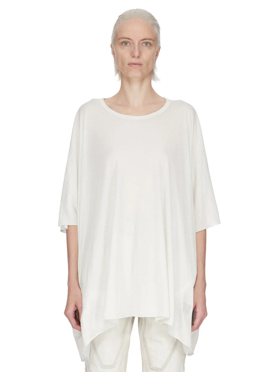 DRKSHDW SS26 TEMPLE MINERVA T IN MILK WASH COTTON GAUZE JERSEY THIS MINERVA T IS A BELOW HIP LENGTH DRAPED T SHIRT WITH A RAW CUT HEM THAT DIPS SLIGHTLY LOWER AT SIDES. IT HAS A WIDE ROUND NECK AND ELBOW LENGTH BATWING SLEEVES. THIS LIGHTWEIGHT AND AIRY COTTON GAUZE JERSEY IS SEMI TRANSPARENT AND HAVE A SOFT WASHED HAND FEEL. THIS JERSEY IS GARMENT DYED. THIS FABRIC IS MADE USING GOTS CERTIFIED ORGANIC COTTON WHICH MEANS THE NATURAL FIBER IS GROWN WITHOUT HARMFUL CHEMICALS, LEAVING OUR SOIL, AIR AND WATER CLEANER FROM CONTAMINATES. COLOR: MILK WASH MATERIAL:100% COTTON MODEL IS 181CM TALL MODEL WEARS SIZE S