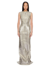 DRKSHDW FW25 CONCORDIANS COLUMN DRESS IN PALLADIUM FOIL STRETCH DENIM THIS COLUMN DRESS TRAILS FLOOR LENGTH AT FRONT, HAS A CLOSE TO THE BODY FIT, A ROUND RAW CUT NECK AND IS SLEEVELESS. IT HAS SEAM LINES ACROSS THE CHEST AND SLOPING DOWN THE SIDE BODY WRAPPING TO THE HEM. IT HAS A CENTRE BACK ZIPPER WITH PULL TAB AND A RAW CUT HEM. THIS LIGHTWEIGHT STRETCH DENIM IS OVERDYED AND TREATED WITH A PALLADIUM FOIL OVERLAY AND WASHED TO ACHIEVE THE IRREGULAR LOOK SINCE THE FOIL IS PRESSED ON TOP OF THE FINAL GARMENTS, EACH PIECE WILL HAVE ITS OWN UNIQUE LOOK AND CREASES SINCE THE FOIL WILL ATTACH TO DIFFERENT PLACES DEPENDING ON THE GARMENT THIS GARMENT IS TREATED IN AN ITALIAN WASH HOUSE BASED IN THE VENETO AREA OF ITALY, THAT PRODUCES IN SMALLER TREATMENT BATHS TO REDUCE WATER WASTE AND UTILIZE A WATER PURIFYING PROCESS THAT ENABLES THEM TO RECYCLE A PORTION OF THE WATER USED. ALL OF OUR DENIM WASHES ARE ZDHC CERTIFIED COLOR: PALLADIUM MATERIAL: 90% COTTON + 7% POLYESTER + 3% RUBBER FIBER MODEL IS 181CM TALL MODEL WEARS SIZE S