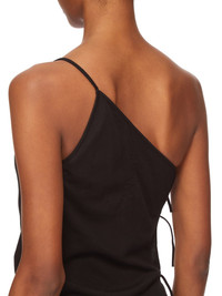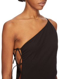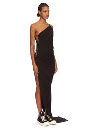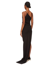 DRKSHDW SS25 HOLLYWOOD TACO DRESS IN BLACK MEDIUM WEIGHT COTTON JERSEY THIS TACO DRESS TRAILS FLOOR LENGTH AT BACK AND HAS AN ASYMMETRICAL NECKLINE WITH ONE THIN SHOULDER STRAP. IT FEATURES AN OPEN RIGHT SIDE BODY THAT SECURES WITH TIES ALL THE WAY DOWN TO THE HIP, REVEALING THE SIDE BODY AND LEG. ITS SKIRT TAPERS TO THE FLOOR THIS MEDIUMWEIGHT COTTON JERSEY HAS A COMPACT AND DRY HANDFEEL. THIS JERSEY IS GARMENT DYED THIS FABRIC IS MADE USING GOTS CERTIFIED ORGANIC COTTON WHICH MEANS THE NATURAL FIBER IS GROWN WITHOUT HARMFUL CHEMICALS, LEAVING OUR SOIL, AIR AND WATER CLEANER FROM CONTAMINATES COLOR: BLACK MATERIAL: 100% COTTON MODEL IS 181CM TALL MODEL WEARS SIZE S
