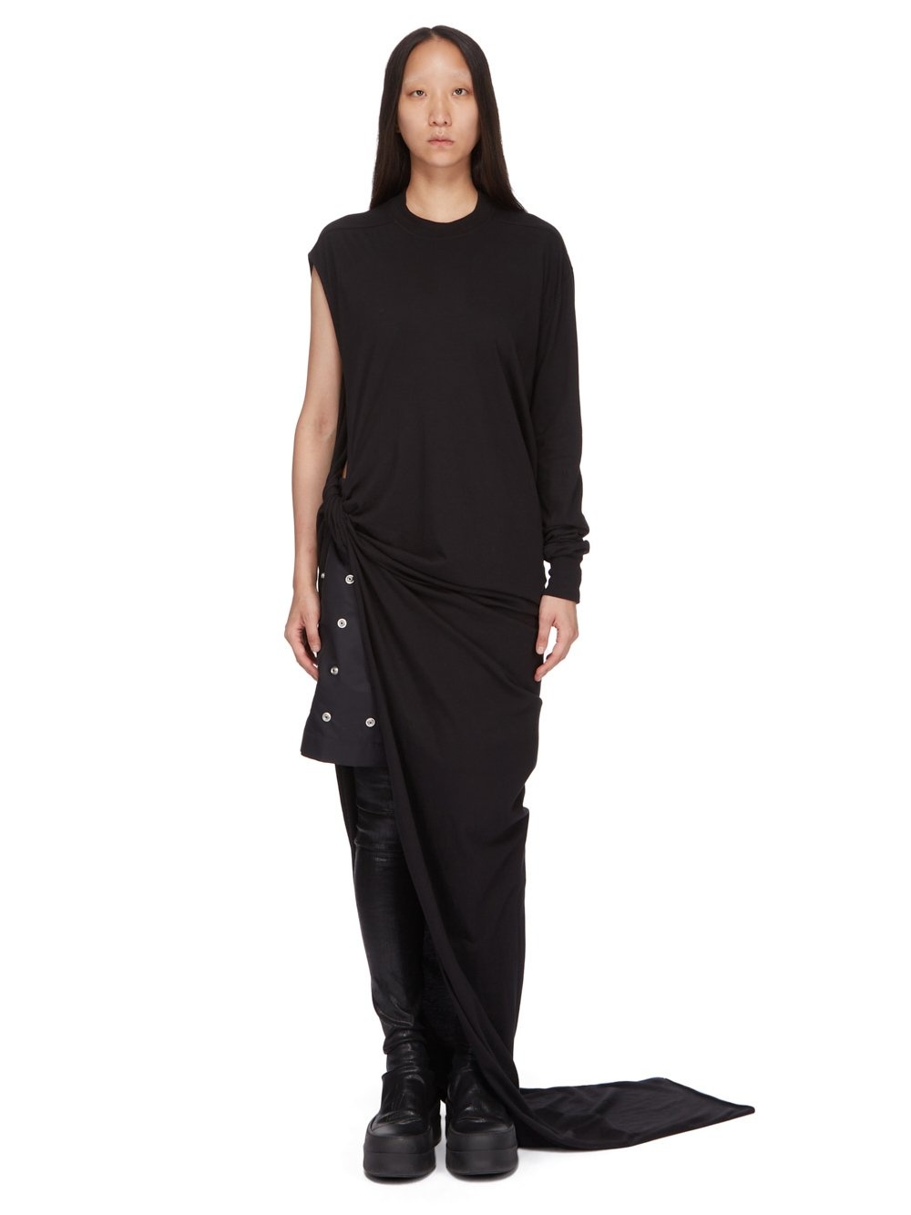 DRKSHDW SS24 LIDO EDFU GOWN IN BLACK MEDIUM WEIGHT COTTON JERSEY THIS EDFU GOWN TRAILS FLOOR LENGTH. IT HAS A LOOSE SQUARE CUT BODY WITH A BOAT NECK AND LEVEL SHOULDER SEAMS. IT HAS ONE LONG SLEEVE ON THE LEFT WITH CAPE SLEEVE OPENING, AND CAN BE WORN WITH THE ARM OUT. IT IS ALSO OPEN ON THE RIGHT SIDE OF THE TORSO. IT DRAPES INTO A TWIST ON THE RIGHT HIP, BEFORE TAPERING TO THE FLOOR. IT CAN ALSO BE WORN TOGA-LIKE, BY PLACING THE TOP ASYMMETRICALLY ACROSS THE BODY, AND THE HEAD AND SHOULDER COMING OUT OF THE OPEN RIGHT SIDE THIS MEDIUMWEIGHT COTTON JERSEY HAS A COMPACT AND DRY HANDFEEL. THIS JERSEY IS GARMENT DYED THIS FABRIC IS MADE USING GOTS CERTIFIED ORGANIC COTTON WHICH MEANS THE NATURAL FIBER IS GROWN WITHOUT HARMFUL CHEMICALS, LEAVING OUR SOIL, AIR AND WATER CLEANER FROM CONTAMINATES - COLOR: BLACK - MATERIAL: 100% COTTON - MODEL IS 181CM TALL - ITEM IS AVAILABLE IN ONE SIZE