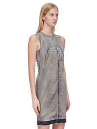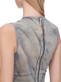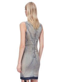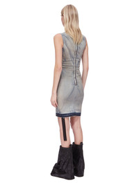DRKSHDW FW24 PORTERVILLE SPLINTERED DENIM DRESS IN SKY SKY STRETCH DENIM THIS SPLINTERED DENIM DRESS IS MID-THIGH LENGTH, WITH A CLOSE TO THE BODY FIT. IT IS SLEEVELESS WITH A ROUND NECK AND LEVEL SHOULDER SEAMS. IT HAS A SIGNATURE SPLINTERED MOTIVO, WITH SEAM LINES DESCENDING FROM THE NECK TO A BLUNT POINT BELOW THE BUST AND ACROSS THE CHEST, SLOPING DOWN THE SIDE BODY WRAPPING TO THE HEM. IT HAS A CENTRE BACK ZIPPER AND RAW CUT HEM THIS LIGHTWEIGHT INDIGO STRETCH DENIM IS STONE WASHED AND THEN OVERDYED WITH MINERALS TO CREATE THE SKY COLORATION THIS GARMENT IS TREATED IN AN ITALIAN WASH HOUSE BASED IN THE VENETO AREA OF ITALY, THAT PRODUCES IN SMALLER TREATMENT BATHS TO REDUCE WATER WASTE AND UTILIZE A WATER PURIFYING PROCESS THAT ENABLES THEM TO RECYCLE A PORTION OF THE WATER USED. ALL OF OUR DENIM WASHES ARE ZDHC CERTIFIED - COLOR: SKY - MATERIAL: 91% COTTON + 6% ELASTOMULTIESTER + 3% RUBBER - MODEL IS 181CM TALL - MODEL WEARS SIZE XS