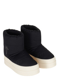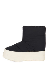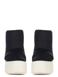 DRKSHDW FW24 PORTERVILLE MEGA BUMPER LOW LUNAR IN BLACK/PEARL/MILK COTTON NYLON FAILLE THESE MEGA BUMPER LUNAR ARE ABOVE-ANKLE HEIGHT. THEY HAVE A SOFT PADDED PULL ON BOOT UPPER, WITH QUILTED STITCHED PANELS. THEY FEATURE DOUBLE HEIGHT, SHARK-TOOTHED MEGA BUMPER SOLES THIS COTTON NYLON BLEND HAS A MICRO FAILLE STRUCTURE AND A SOFT HANDFEEL. THIS PRODUCT WAS MADE USING CERTIFIED RECYCLED POLYAMIDE BECAUSE IS ENSURES A REDUCTION IN WATER CONSUMPTION, EMISSIONS AND HAZARDOUS WASTE, LESSENING THE DEPENDENCE ON NON-RENEWABLE RESOURCES THIS FABRIC WAS ALSO MADE USING GOTS CERTIFIED ORGANIC COTTON WHICH MEANS THE NATURAL FIBER IS GROWN WITHOUT HARMFUL CHEMICALS, LEAVING OUR SOIL, AIR AND WATER CLEANER FROM CONTAMINATES - COLOR: BLACK/PEARL/MILK - MATERIAL: UPPER 53% NYLON + 47% COTTON - LINING 100% NYLON - PADDING 70% POLYURETHANE + 30% POLYESTER - INSOLE 60% POLYURETHANE + 40% POLYESTER - SOLE 100% THERMOPLASTIC RUBBER - EMBROIDERY 100% POLYESTER