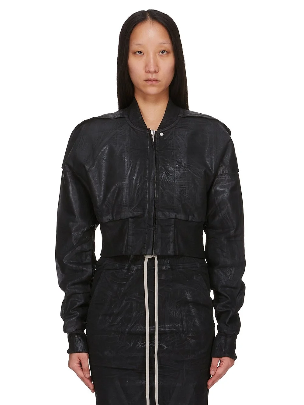 DRKSHDW SS25 HOLLYWOOD FLIGHT JKT CROPPED IN BLACK OVERDYED FOIL STRETCH DENIM THIS FLIGHT JKT CROPPED IS WAIST LENGTH WITH LONG SLEEVES. IT HAS A CENTRE FRONT ZIPPER WITH PLACKET AND TOP SNAP AND A RIBBED COLLAR, CUFFS AND WIDE WAISTBAND. IT FEATURES A ROUNDED FIT WITH A DROPPED ARMHOLE, AND STITCHING DETAIL ON THE LEVEL SHOULDER SEAM CURVING TO THE ARM HOLE. IT IS FULLY LINED WITH TWO INTERNAL ZIPPERED POCKETS THIS LIGHTWEIGHT FOIL DENIM IS MADE ON A 10OZ STRETCH DENIM. THE READY GARMENT IS OVERDYED AND HAS A CLEAR, SEMI SHINY FOIL OVERLAY THAT CREATES A WAXY TOUCH SINCE THE FOIL IS PRESSED ON TOP OF THE FINAL GARMENTS, EACH PIECE WILL HAVE ITS OWN UNIQUE LOOK AND CREASES SINCE THE FOIL WILL ATTACH TO DIFFERENT PLACES DEPENDING ON THE GARMENT THIS GARMENT IS TREATED IN AN ITALIAN WASH HOUSE BASED IN THE VENETO AREA OF ITALY, THAT PRODUCES IN SMALLER TREATMENT BATHS TO REDUCE WATER WASTE AND UTILIZE A WATER PURIFYING PROCESS THAT ENABLES THEM TO RECYCLE A PORTION OF THE WATER USED. ALL OF OUR DENIM WASHES ARE ZDHC CERTIFIED. COLOR: BLACK MATERIAL: 90% COTTON + 7% POLYESTER + 3% RUBBER KNIT RIB COLLAR, WRIST BAND AND BOTTOM 100% COTTON BODY AND POCKETS LINING 100% COTTON SLEEVES LINING 100% NYLON MODEL IS 181CM TALL MODEL WEARS SIZE S