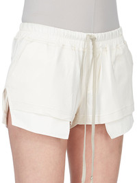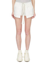DRKSHDW SS26 TEMPLE FOG BOXERS IN CREAM LIQUID JERSEY THESE FOG BOXERS ARE CUT HIGH ON THE THIGH. THEY HAVE AN ELASTICIZED WAISTBAND WITH DRAWSTRING, SIDE WELT POCKETS AND SIDE SLITS. THIS LIGHTWEIGHT AND FLUID ACETATE JERSEY HAS A COOL AND SOFT HANDFEEL. A FINAL CINZ HEAT PRESS TREATMENT GIVES THIS JERSEY ITS SHINE. COLOR: CREAM MATERIAL:80% ACETATE + 20% NYLON POCKETS LINING 52% POLYESTER + 48% COTTON MODEL IS 181CM TALL MODEL WEARS SIZE S