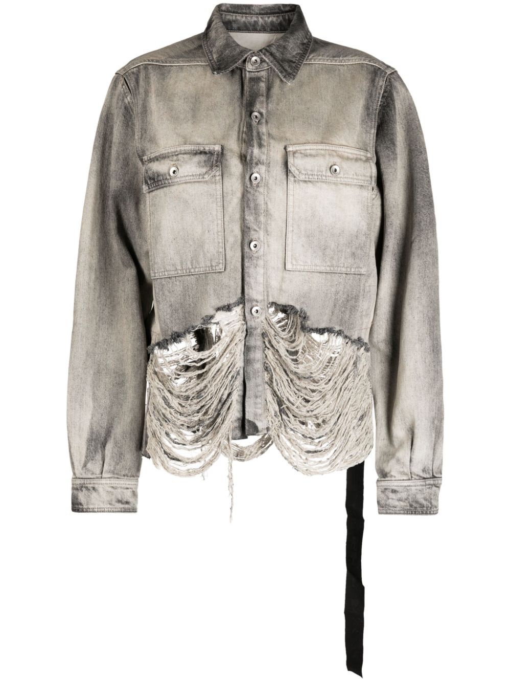 distressed-effect denim shirt Highlights - Light grey - Cotton - Distressed effect - Two front flap pockets - Front button fastening - Classic collar - Long sleeves - Curved hem Composition Outer: Cotton 100% Lining: Polyester 52%, Cotton 48% Sleeve Lining: Polyamide 100% SIZE & FIT Model measurements Height 5 ft 10 in(1.78 m) Bust/Chest 29.1 in(74 cm) Hips 35.4 in(90 cm) Waist 23.6 in(60 cm) FittingInformation Designed to be unstructured, offering a loose fit throughout Sturdy and hard-wearing, this denim piece offers no stretch This piece fits true to size – take your usual size