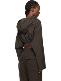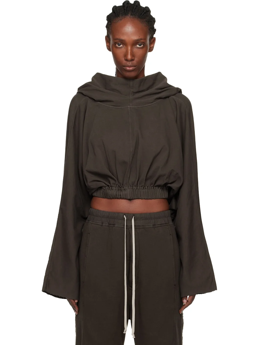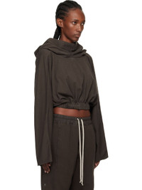 Heavyweight GOTS-certified organic cotton jersey hoodie. · Garment-dyed · Funnel neck · Elasticized cropped hem · Dolman sleeves · Raw edge at cuffs · Central seam at back · Integrated logo-woven strap at interior Supplier color: Dark dust 100% cotton. Made in Italy 252126F097005