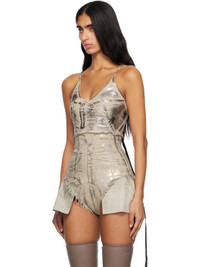 Foil-coated and waxed non-stretch cotton-blend denim camisole. · V-neck · Darts at chest · Fixed spaghetti straps · Frayed edges at hem · Zip closure at back Supplier color: Palladium 90% cotton, 7% polyester, 3% rubber. Made in Italy 252126F111007
