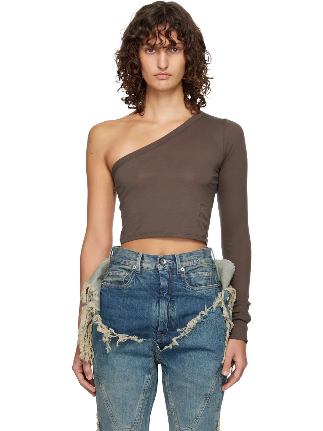 Semi-sheer GOTS-certified organic cotton jersey T-shirt. · Single-shoulder construction · Rib-knit asymmetric neck · Raw edge at cuff · Central seam at back · Integrated logo-woven strap at interior side seam Supplier color: Dark dust 100% cotton. Made in Italy 261126F111003