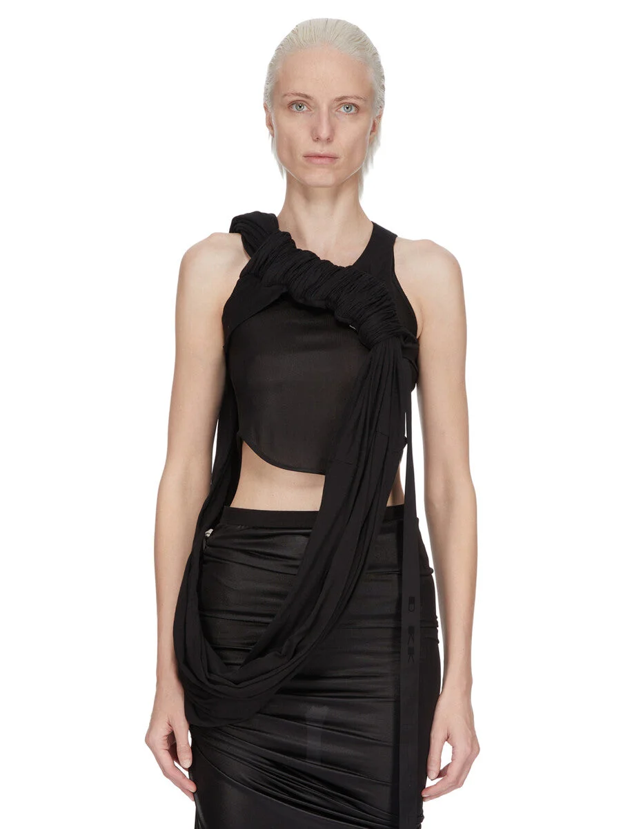 DRKSHDW SS26 TEMPLE HARNESS TANK IN BLACK COTTON GAUZE JERSEY THIS HARNESS TANK FITS OVER THE HEAD AND UNDER THE ARMS. IT HAS TANK SHOULDERS, A ROUNDED NECK AND COVERS THE SHOULDERS AT BACK. IT FEATURES A DRAPE OF FABRIC THAT RUCHES ON THE CHEST AND DRAPES DOWN, IN FOLDS, FROM THE LEFT FRONT TO THE RIGHT HIP, SCOOPING BACK UP TO THE RIGHT SHOULDER AT BACK. THIS LIGHTWEIGHT AND AIRY COTTON GAUZE JERSEY IS SEMI TRANSPARENT AND HAVE A SOFT WASHED HAND FEEL. THIS JERSEY IS GARMENT DYED. THIS FABRIC IS MADE USING GOTS CERTIFIED ORGANIC COTTON WHICH MEANS THE NATURAL FIBER IS GROWN WITHOUT HARMFUL CHEMICALS, LEAVING OUR SOIL, AIR AND WATER CLEANER FROM CONTAMINATES. COLOR: BLACK MATERIAL:100% COTTON MODEL IS 181CM TALL MODEL WEARS SIZE S