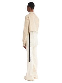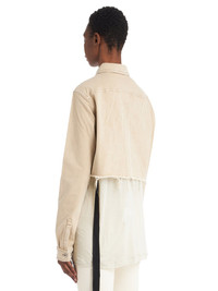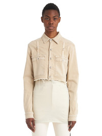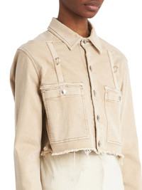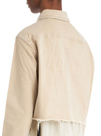 DRKSHDW SS22 FOGACHINE CROPPED OUTERSHIRT IN MINERAL STRETCH DENIM THIS CROPPED OUTERSHIRT IS WAIST LENGTH AND HAS A STRAIGHT FIT. IT HAS A CENTRE FRONT PLACKET WITH VISIBLE BUTTON CLOSURES, A CLASSIC COLLAR AND TWO PATCH POCKETS WITH SNAPS ON THE CHEST, WITH A WEBBING AND D-RING DETAIL ABOVE. IT HAS LONG SLEEVES WITH BUTTONED CUFFS, A RAW HEM AND TOP STITCHING ON ALL SEAMS THIS LIGHTWEIGHT STRETCH DENIM IS SOAKED IN A BATH WITH NATURAL COLOR MINERAL DYES AND TREATED WITH AN ECO-STONE WASH WITH SPONGES GIVING THE EFFECT OF AN ENZYME WASH BUT WITHOUT THE USE OF CHEMICALS - COLOR:MINERAL - MATERIAL:90% COTTON+7% POLYESTER+3% RUBBER - YOKE LINING: 100% COTTON - MODEL IS WEARING SIZE S - MODEL IS 181 CM TALL