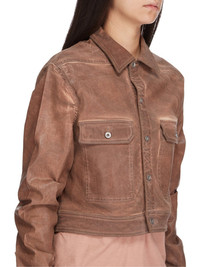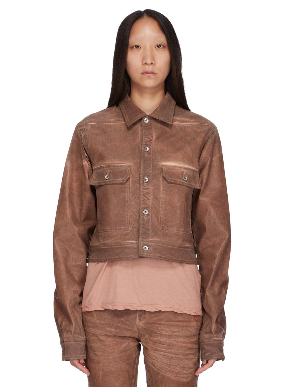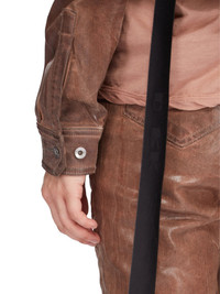 DRKSHDW SS24 LIDO CAPE SLEEVE CROPPED OUTERSHIRT IN HENNA BROWN OVERDYED FOIL STRETCH DENIM THIS CAPE SLEEVE CROPPED OUTERSHIRT IS WAIST LENGTH AND HAS A STRAIGHT FIT. IT HAS A CENTRE FRONT PLACKET WITH VISIBLE METAL BUTTONS, A CLASSIC COLLAR AND SQUARE CHEST POCKETS WITH BEVELED CORNER FLAPS AND BUTTONS. IT HAS LONG SLEEVES WITH BUTTONED CUFFS, SIGNATURE LEVEL SHOULDER SEAMS, A BACK YOKE AND DOUBLE TOP STITCHING ON ALL SEAMS. IT FEATURES CAPE SLEEVES, WITH OPENINGS ON THE FRONT SHOULDER THAT ENABLE THE SLEEVES TO BE WORN NORMALLY, OR WITH THE ARMS OUT, WITH THE SLEEVES HANGING BEHIND THIS LIGHTWEIGHT STRETCH DENIM IS OVERDYED WITH A CLEAR FOIL OVERLAY THAT CREATES THE WAXY TOUCH. THIS GARMENT IS TREATED IN AN ITALIAN WASH HOUSE BASED IN THE VENETO AREA OF ITALY, THAT PRODUCES IN SMALLER TREATMENT BATHS TO REDUCE WATER WASTE AND UTILIZE A WATER PURIFYING PROCESS THAT ENABLES THEM TO RECYCLE A PORTION OF THE WATER USED. ALL OF OUR DENIM WASHES ARE ZDHC CERTIFIED - COLOR: HENNA BROWN - MATERIAL: 90% COTTON + 7% POLYESTER + 3% RUBBER - MODEL IS 181CM TALL - MODEL WEARS SIZE S